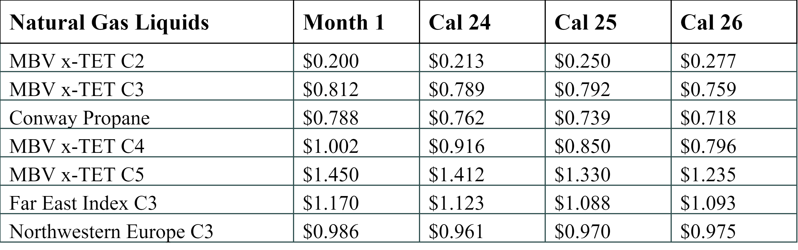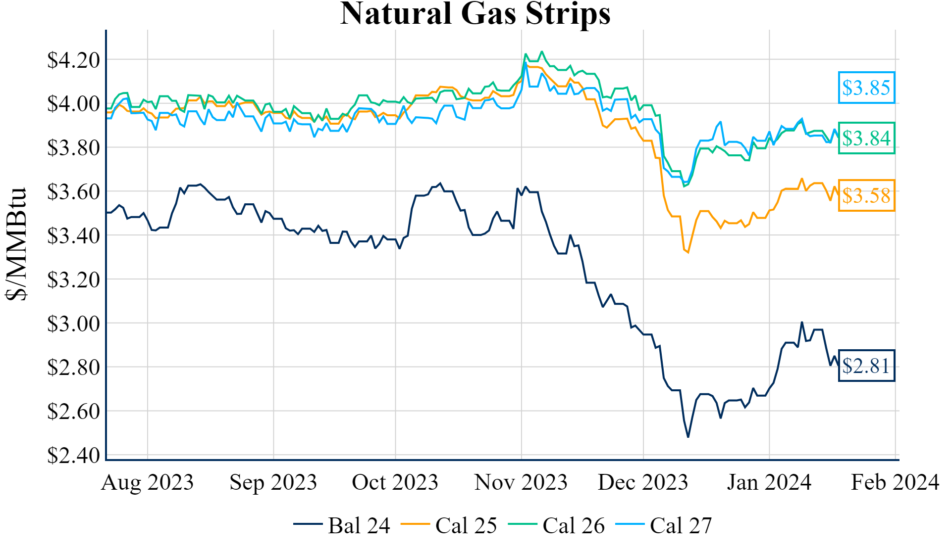 The Winter ‘23/’24 strip is down 4.8c to $2.602, and the Summer ’24 strip is down 4.1c to $2.659
