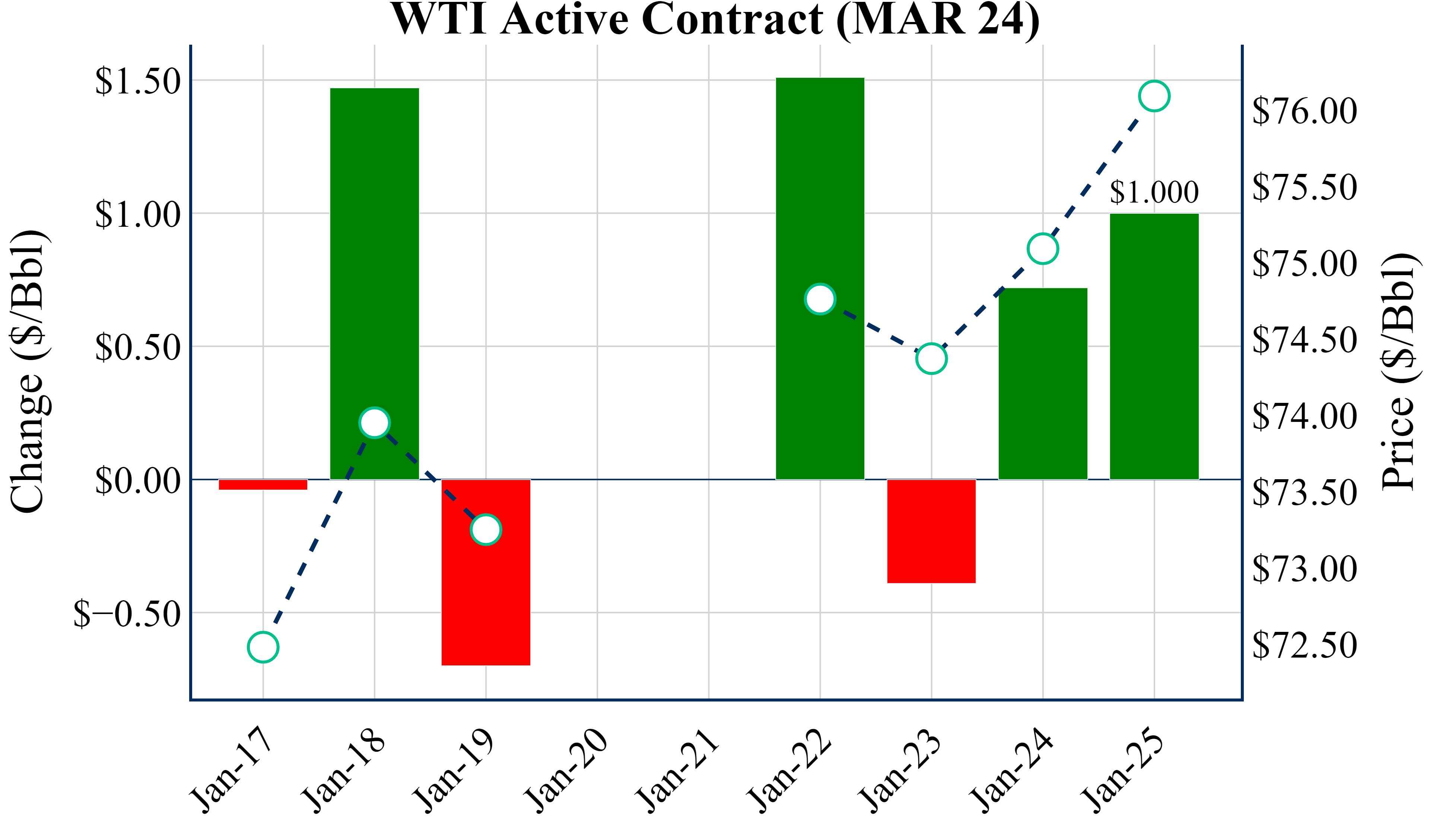 Oil is up more than $1 to $76.35, trading at the highest level since November