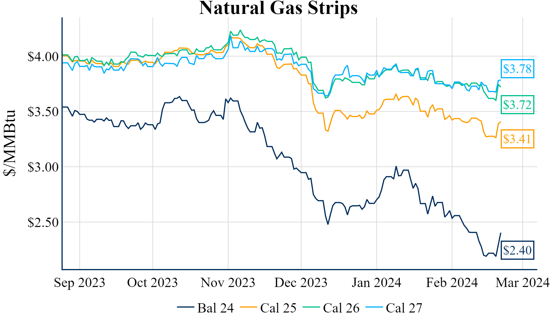 The Summer ’24 strip is up 12.7c to $2.290, and the Winter ‘24/’25 strip is up 6.3c to $3.358
