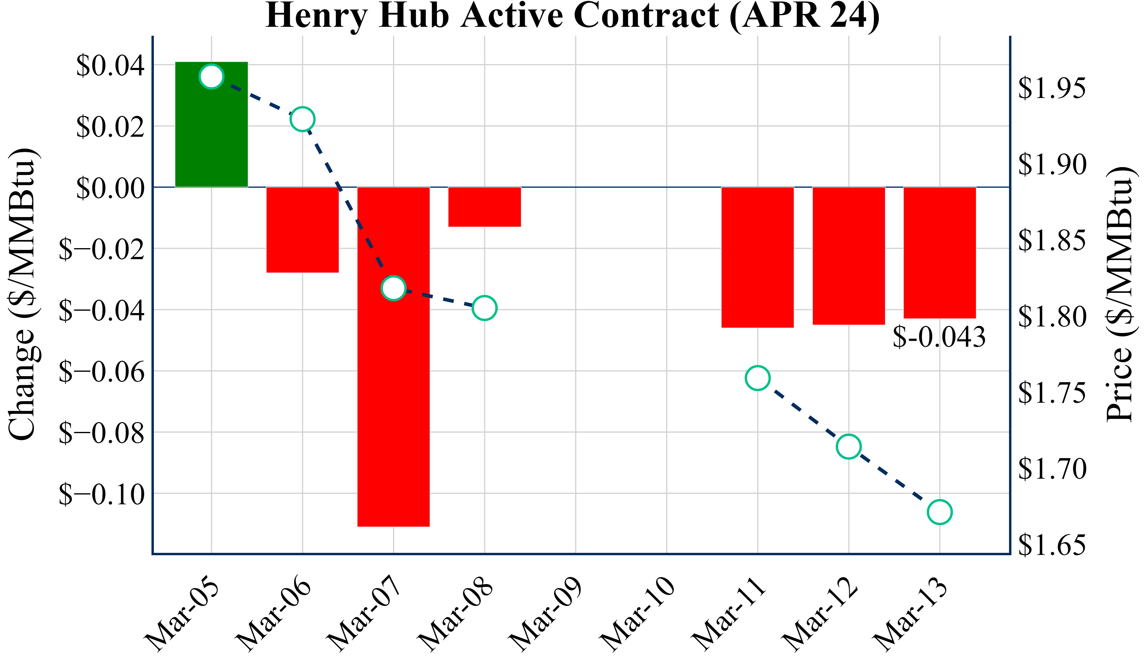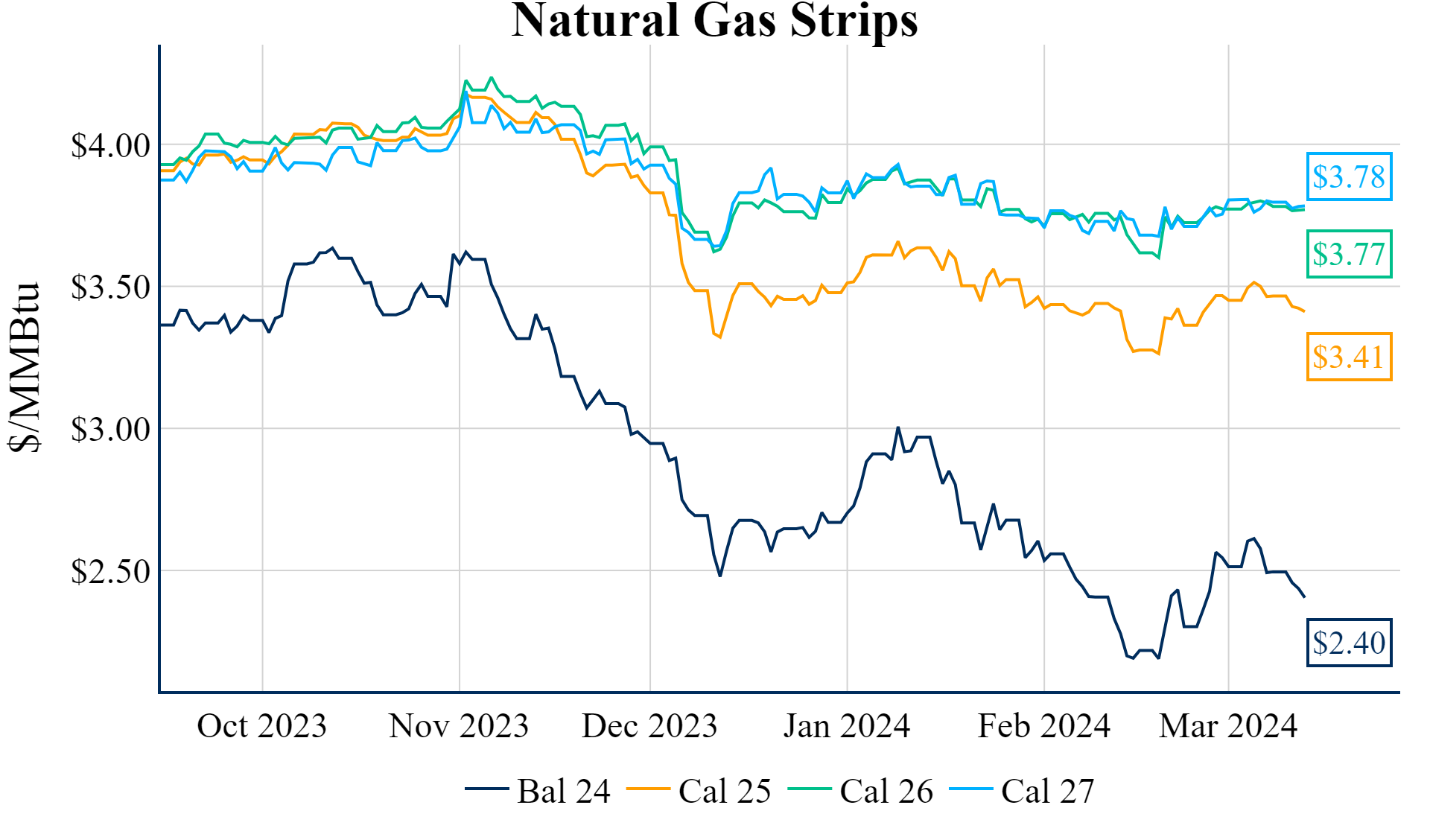 The Summer ’24 strip is down 2.9c to $2.195, and the Winter ‘24/’25 strip is down 1.9c to $3.342