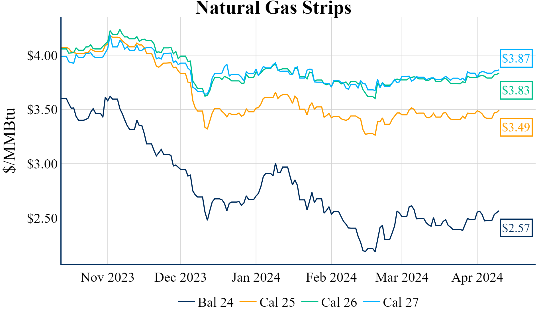 The Summer ’24 strip is up 0.7c to $2.333 and Winter ‘24/’25 strip is up 2c to $3.427