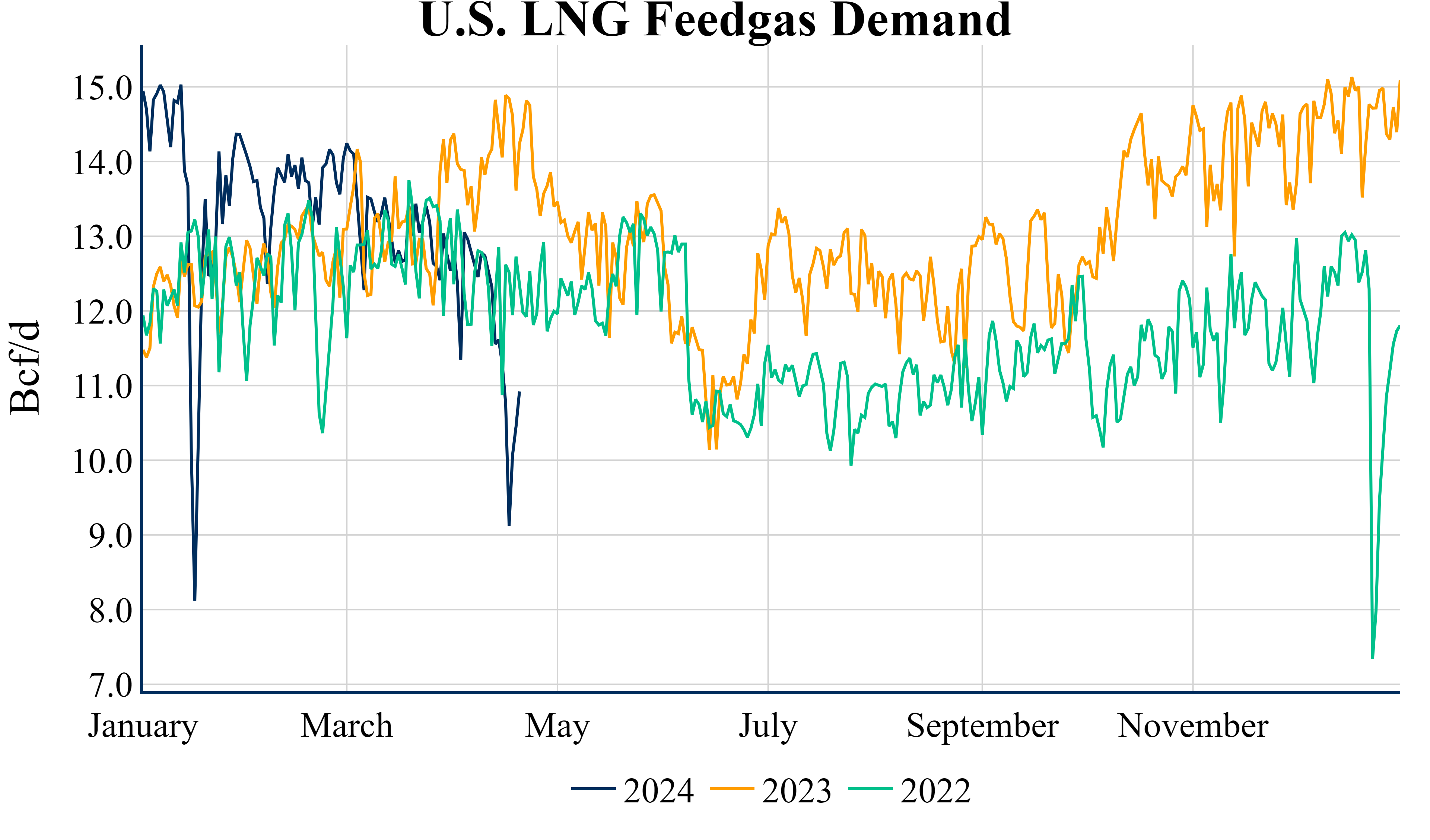 Average gas flows to U.S. LNG export facilities fell to 11.9 Bcf/d in April from 13.1 Bcf/d in March, weighing on gas demand
