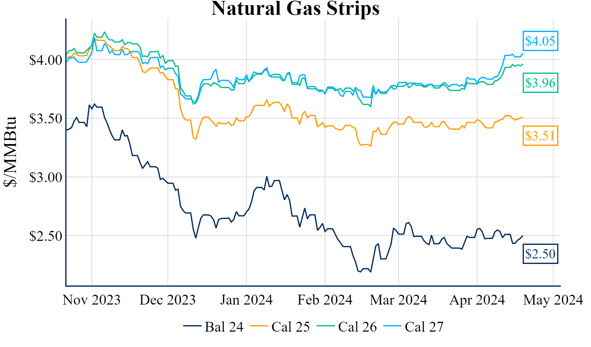 The Summer ’24 strip is up 1.9c to $2.249 and Winter ‘24/’25 strip is up 1.1c to $3.414