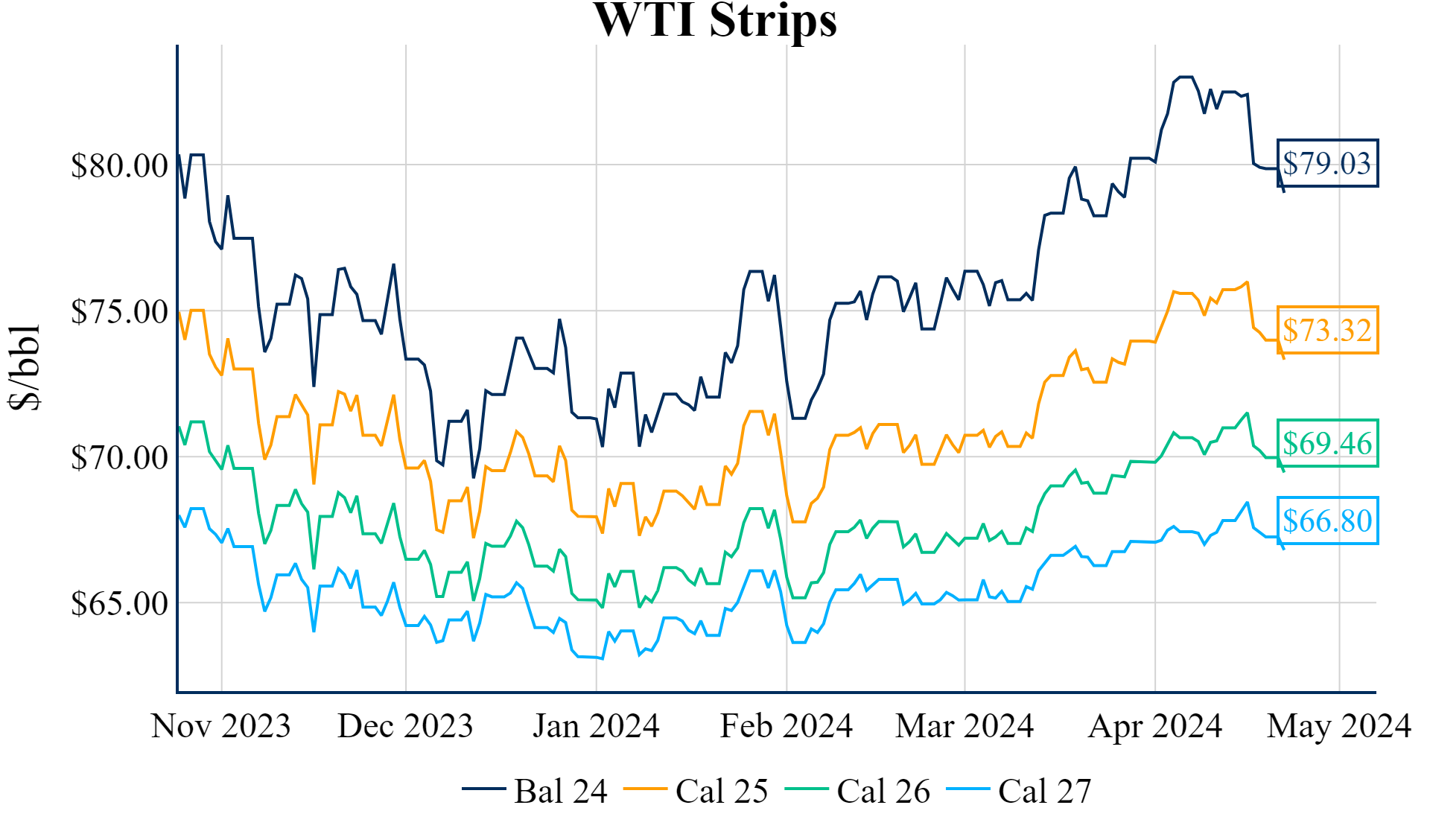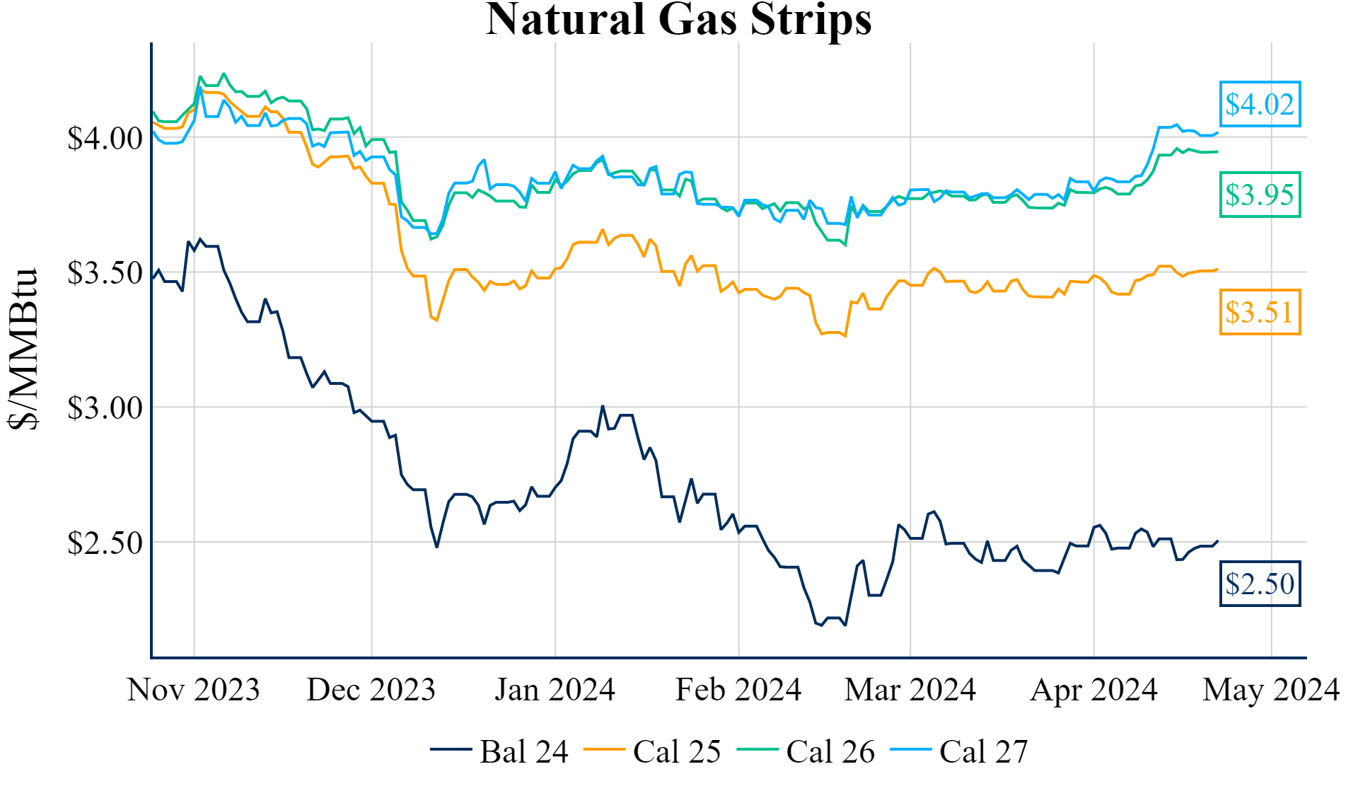 The Summer ’24 strip is up 2.2c to $2.261 and Winter ‘24/’25 strip is up 0.8c to $3.409