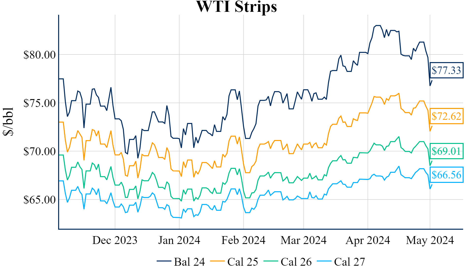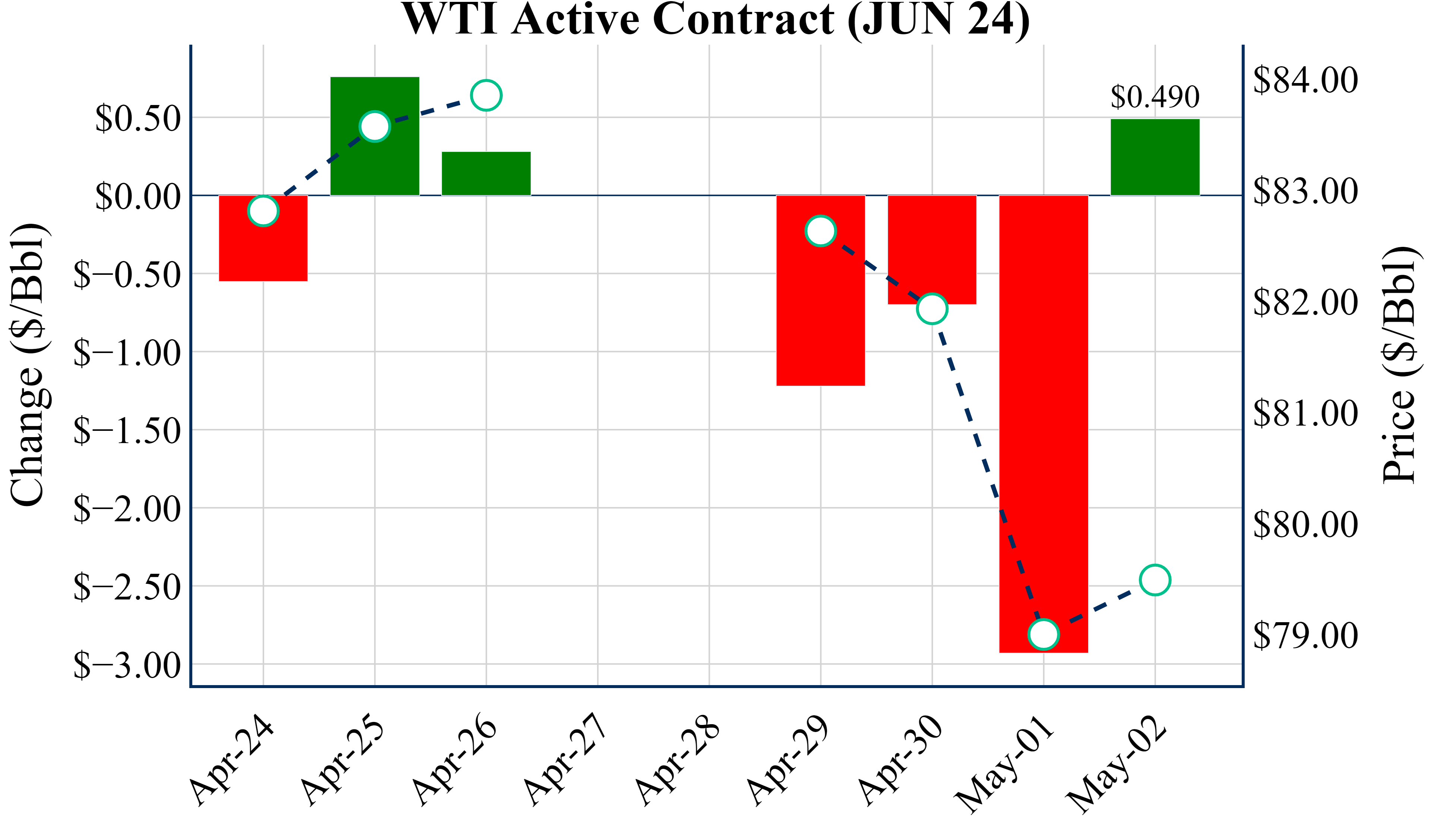 June ’24 WTI gained nearly 30c this morning to trade around $79.28/Bbl (8:30 AM)