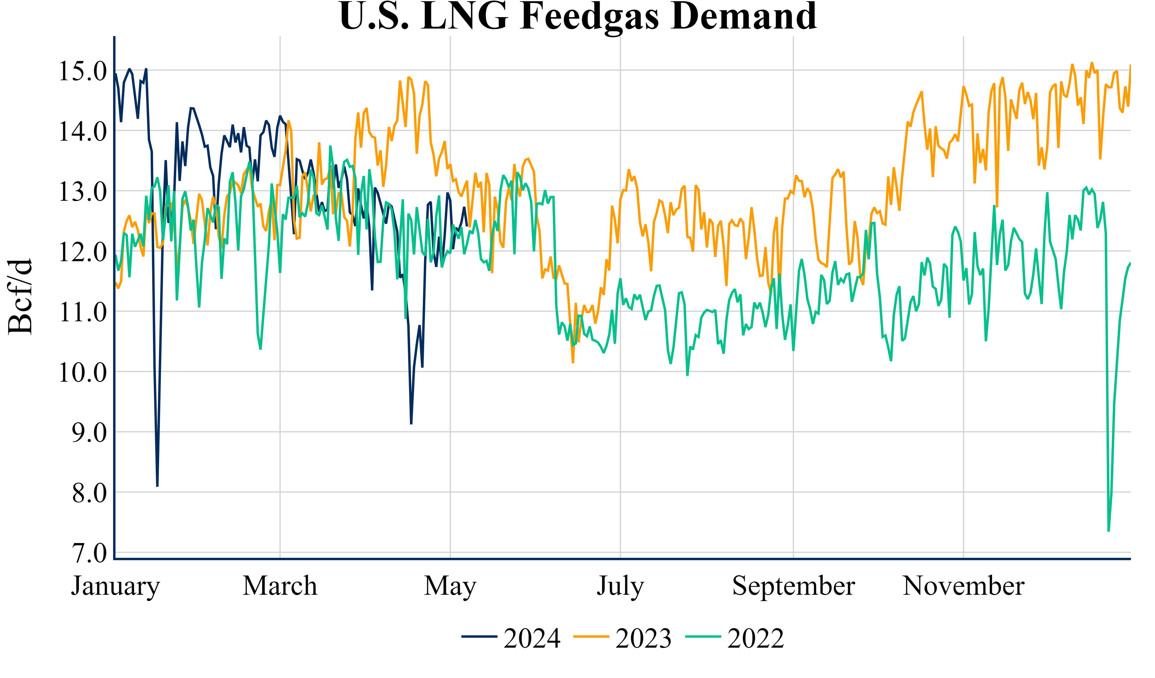 Total US LNG feedgas demand averaged 11.9 Bcf/d in April, decreasing from 13.1 Bcf/d in March amid maintenance and repairs at Freeport’s facilities