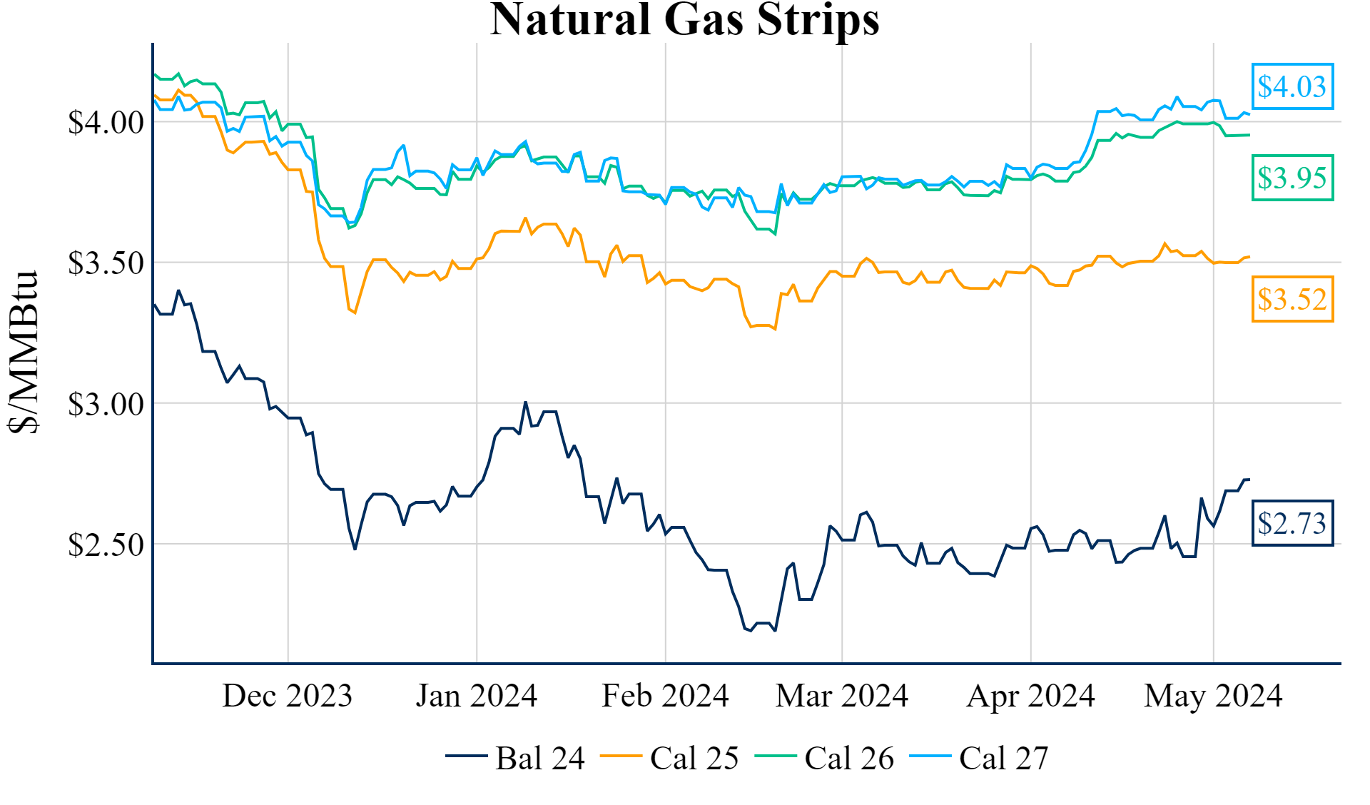 The Summer ’24 strip is down 1.2c to $2.483 and Winter ‘24/’25 strip is down 0.4c to $3.470