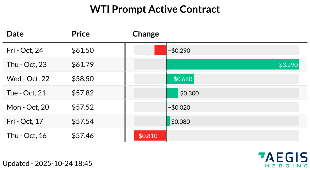 - WTI prompt-month futures rose $0.43 to $59.13/Bbl early Wednesday (7:45 AM CT), rebounding from a five-month low