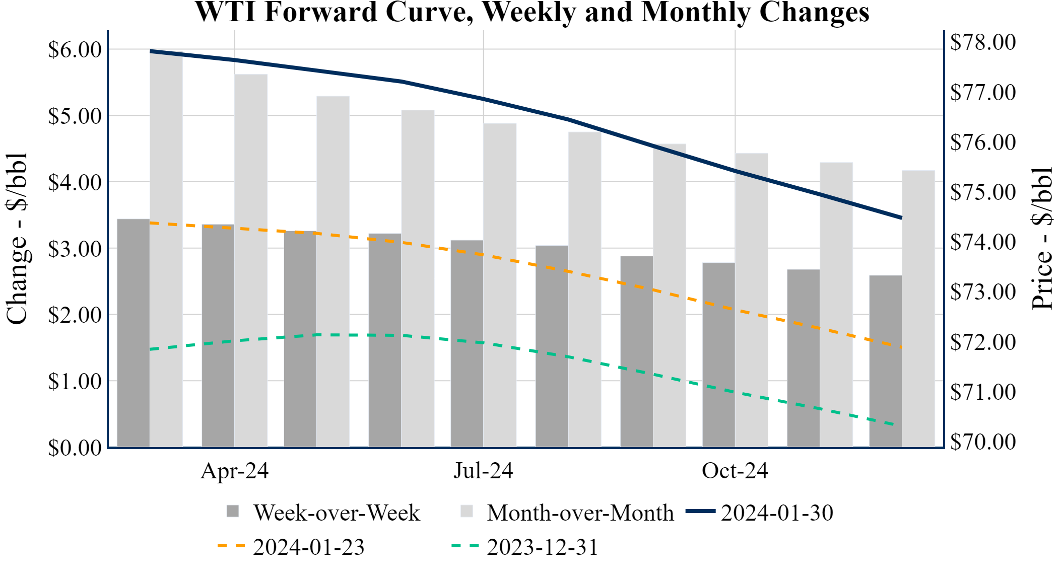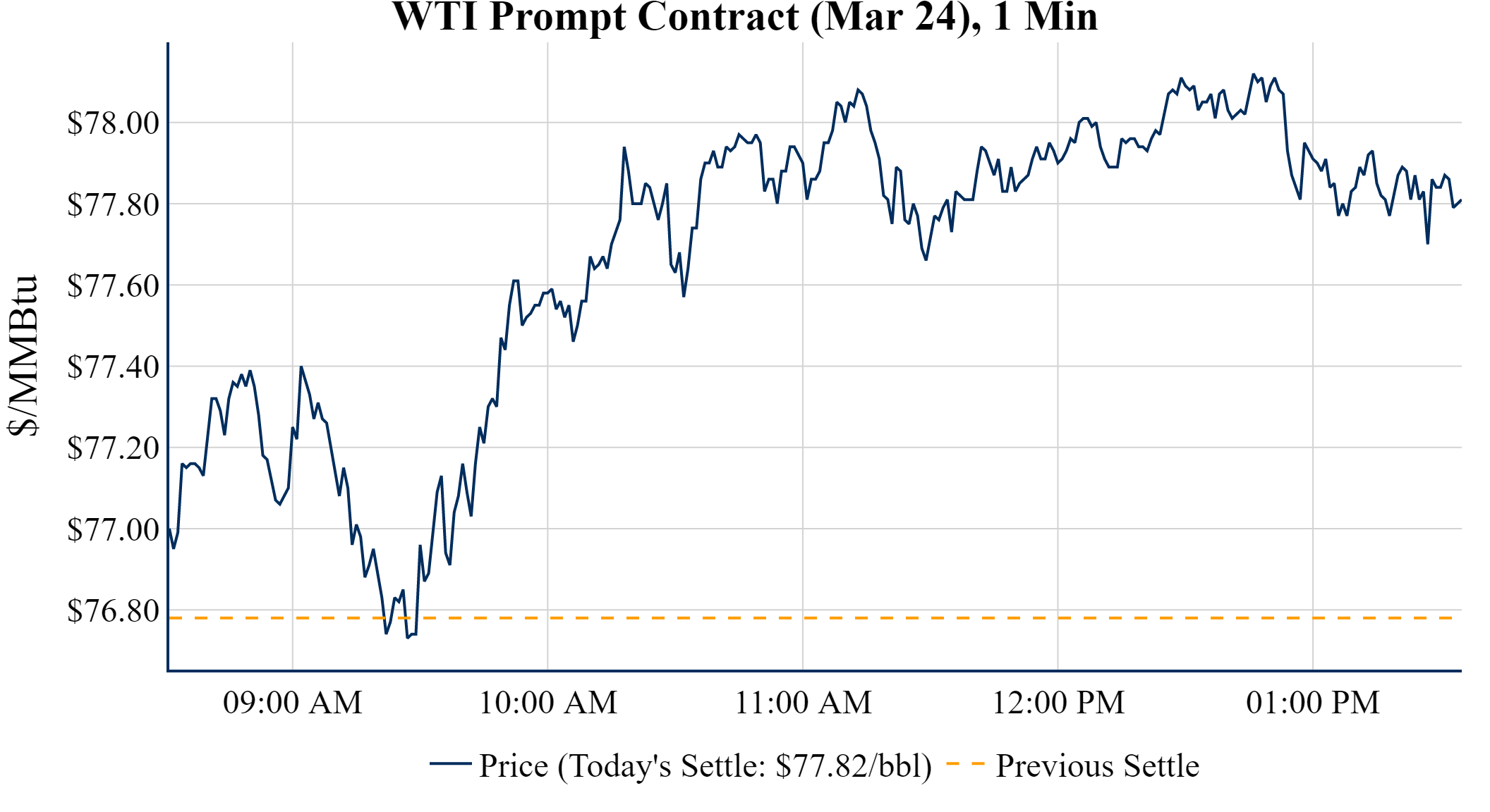 Prompt-Month WTI (Mar 24) was up $1.04 on the day, to settle at $77.82