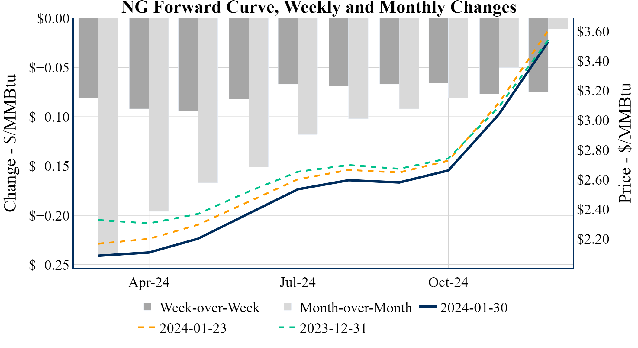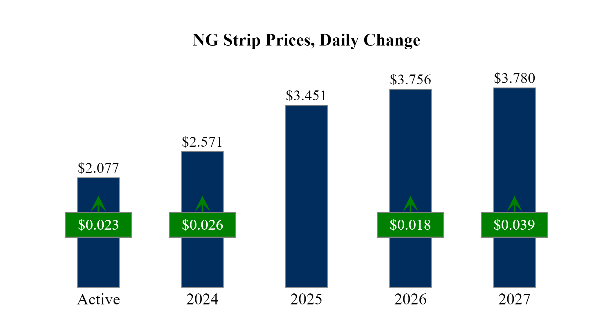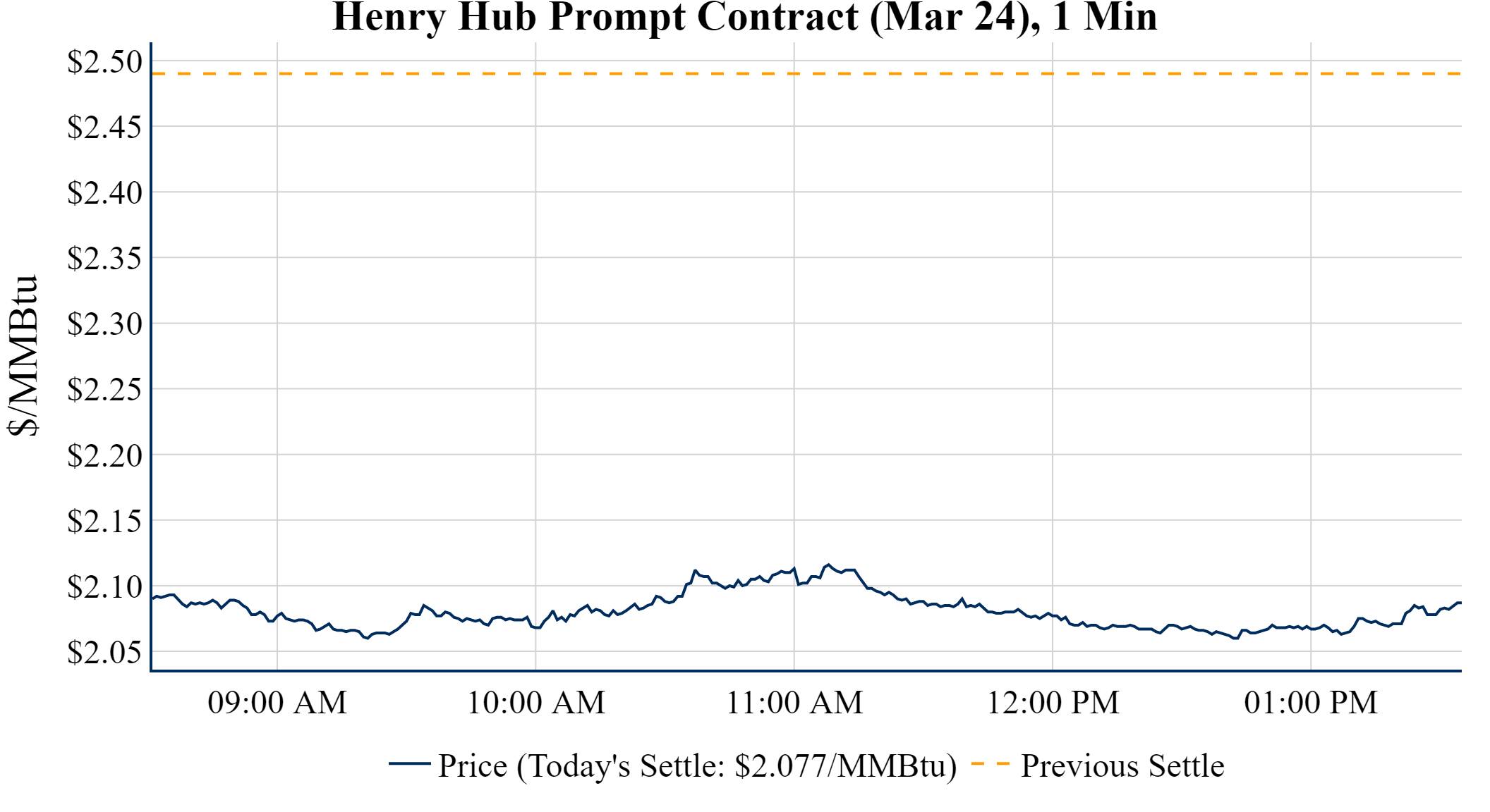 Prompt-Month Henry Hub (Mar 24) was up $0.023 on the day, to settle at $2.077