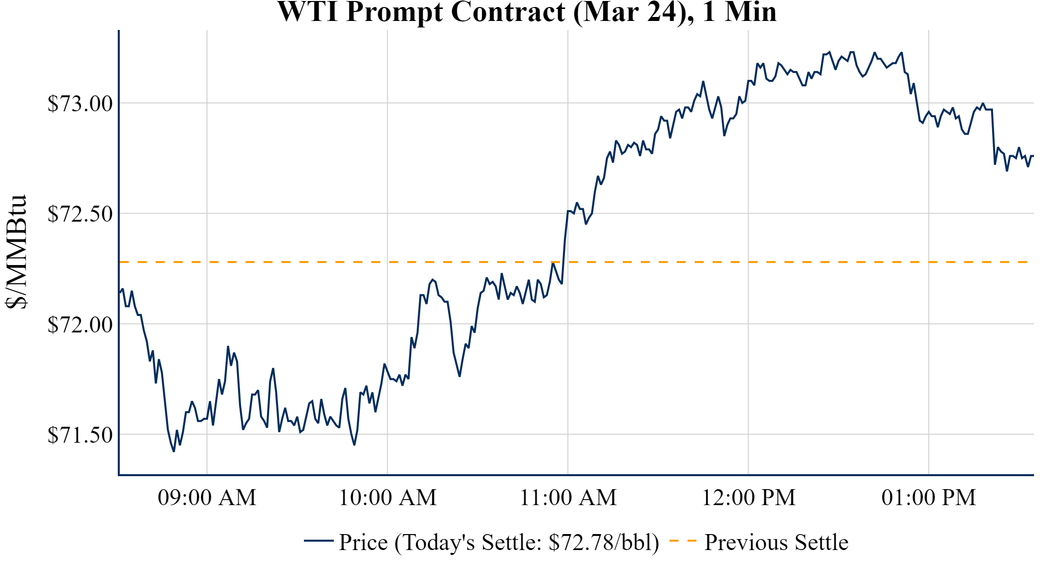 Prompt-Month WTI (Mar 24) was up $0.50 on the day, to settle at $72.78
