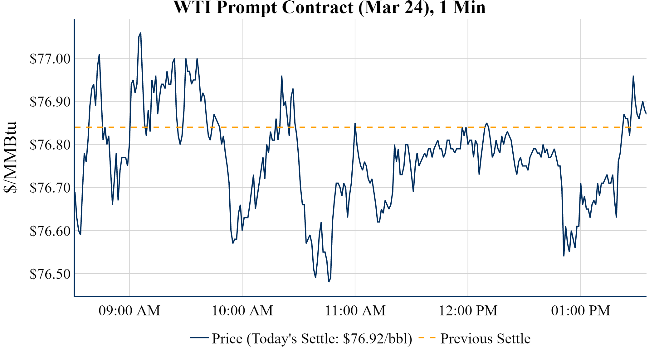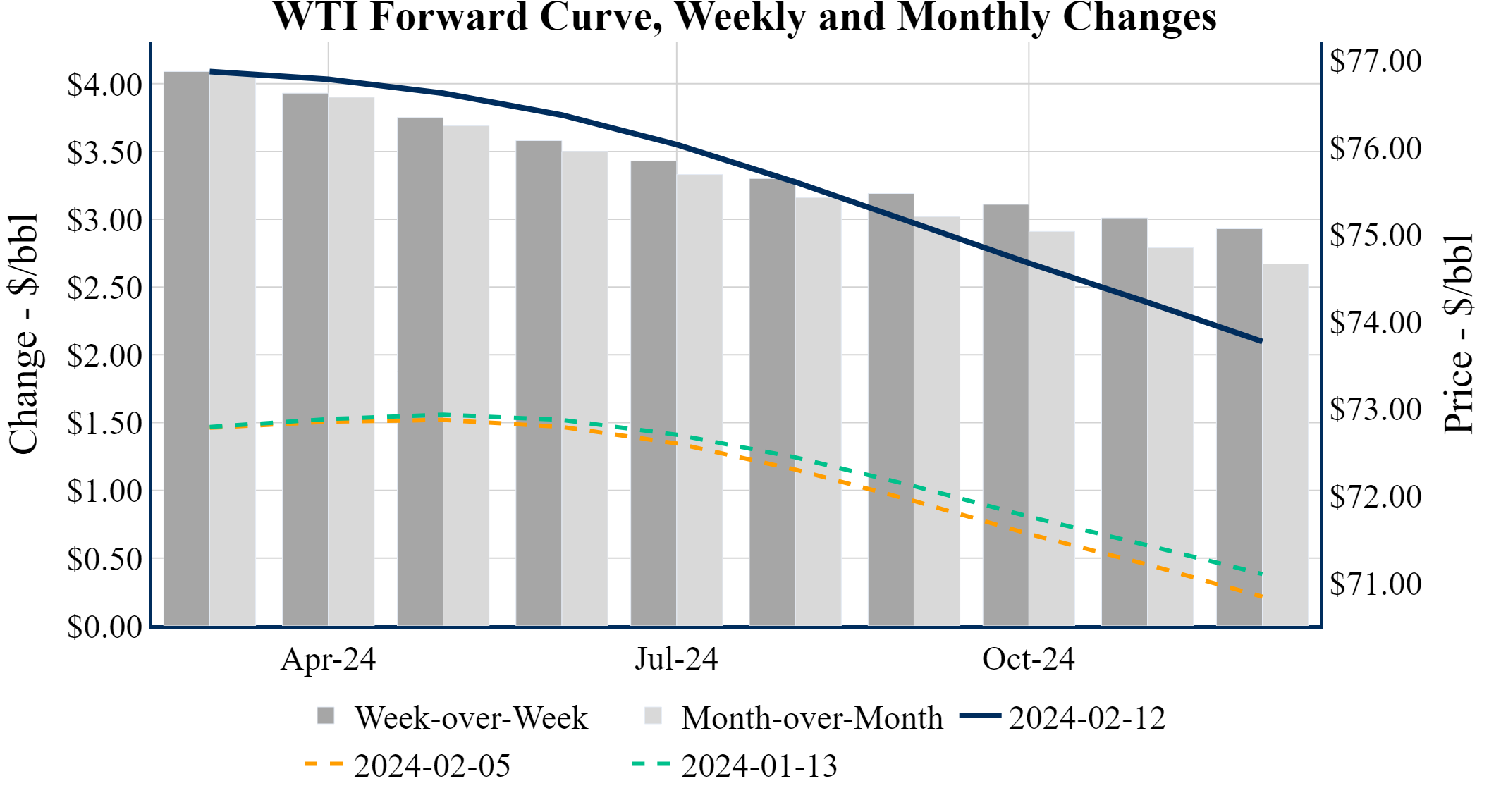 Prompt-Month WTI (Mar 24) was up $0.08 on the day, to settle at $76.92