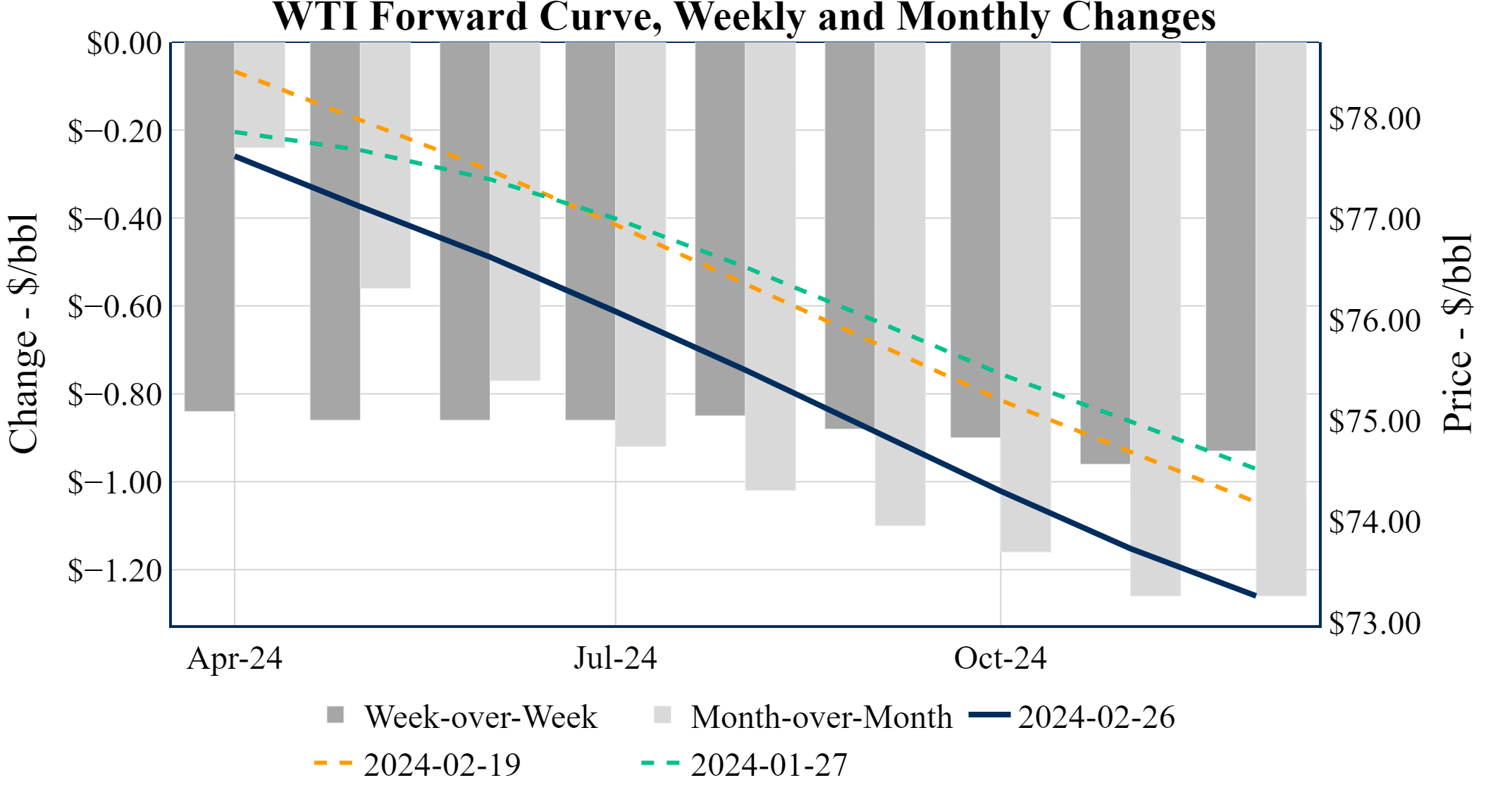 Prompt-Month WTI (Apr 24) was up $1.09 on the day, to settle at $77.58