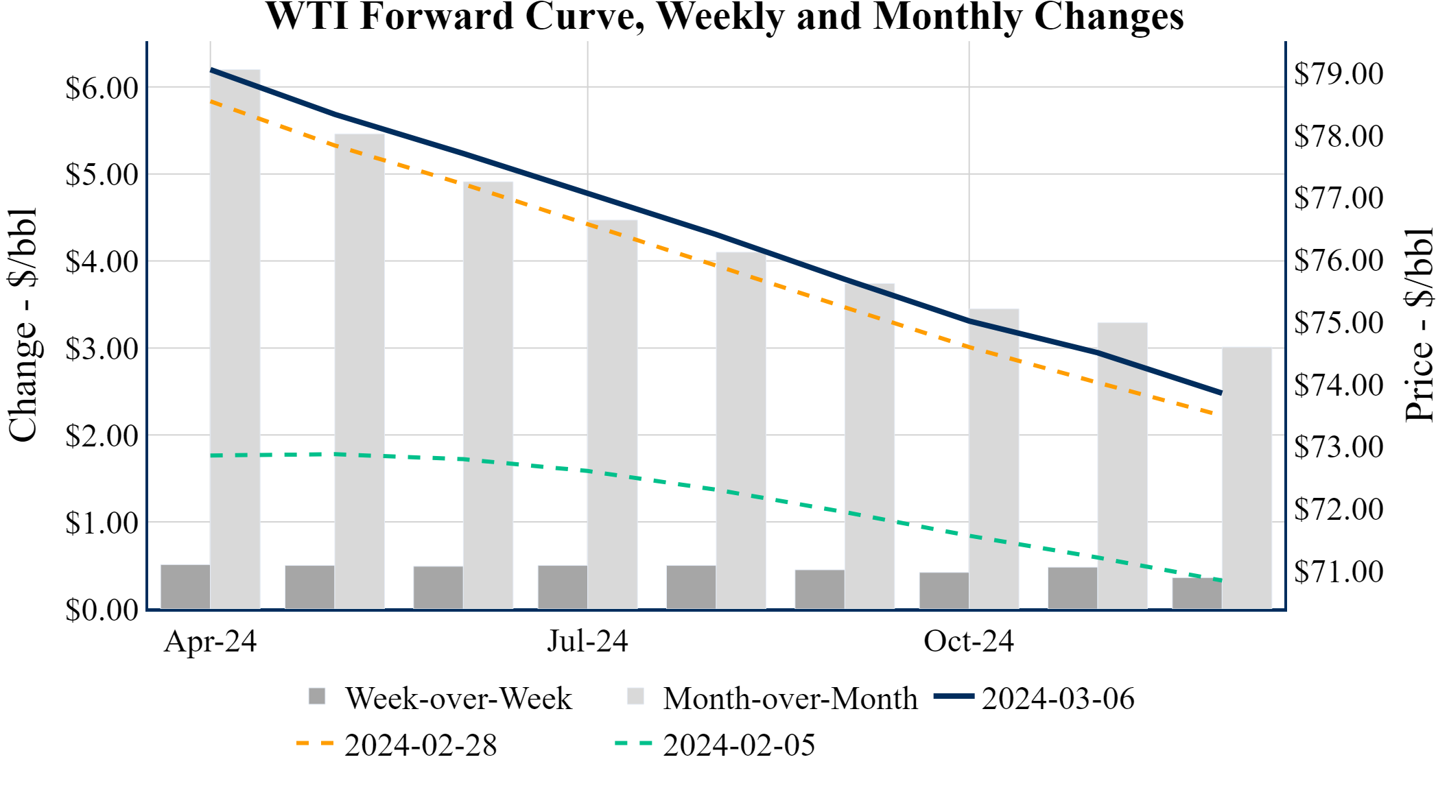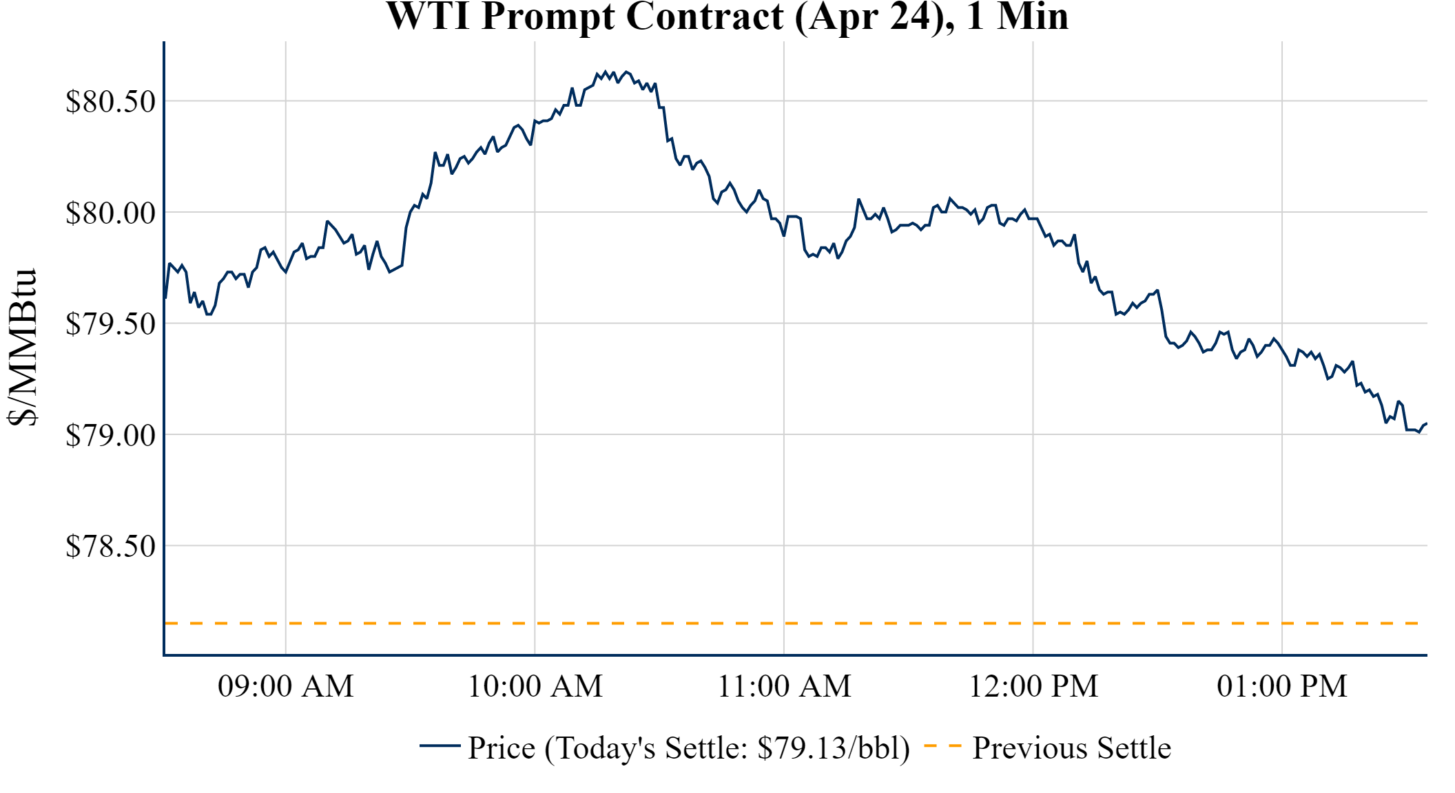 Prompt-Month WTI (Apr 24) was up $0.98 on the day, to settle at $79.13