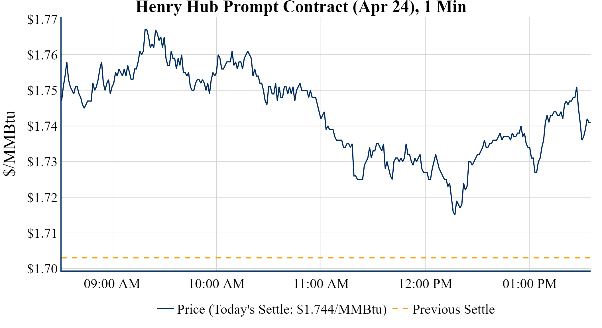 Prompt-Month Henry Hub (Apr 24) was up $0.041 on the day, to settle at $1.744
