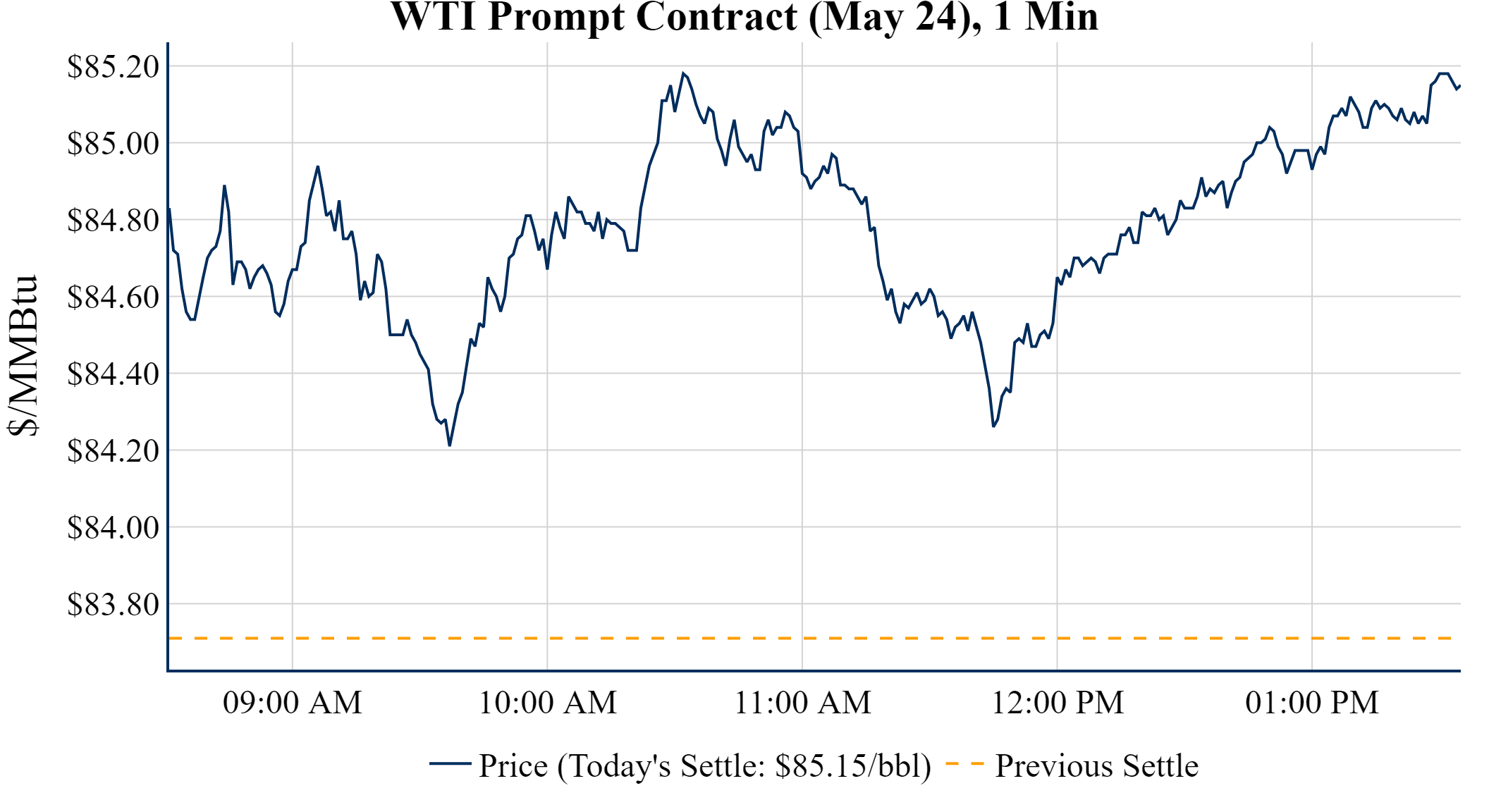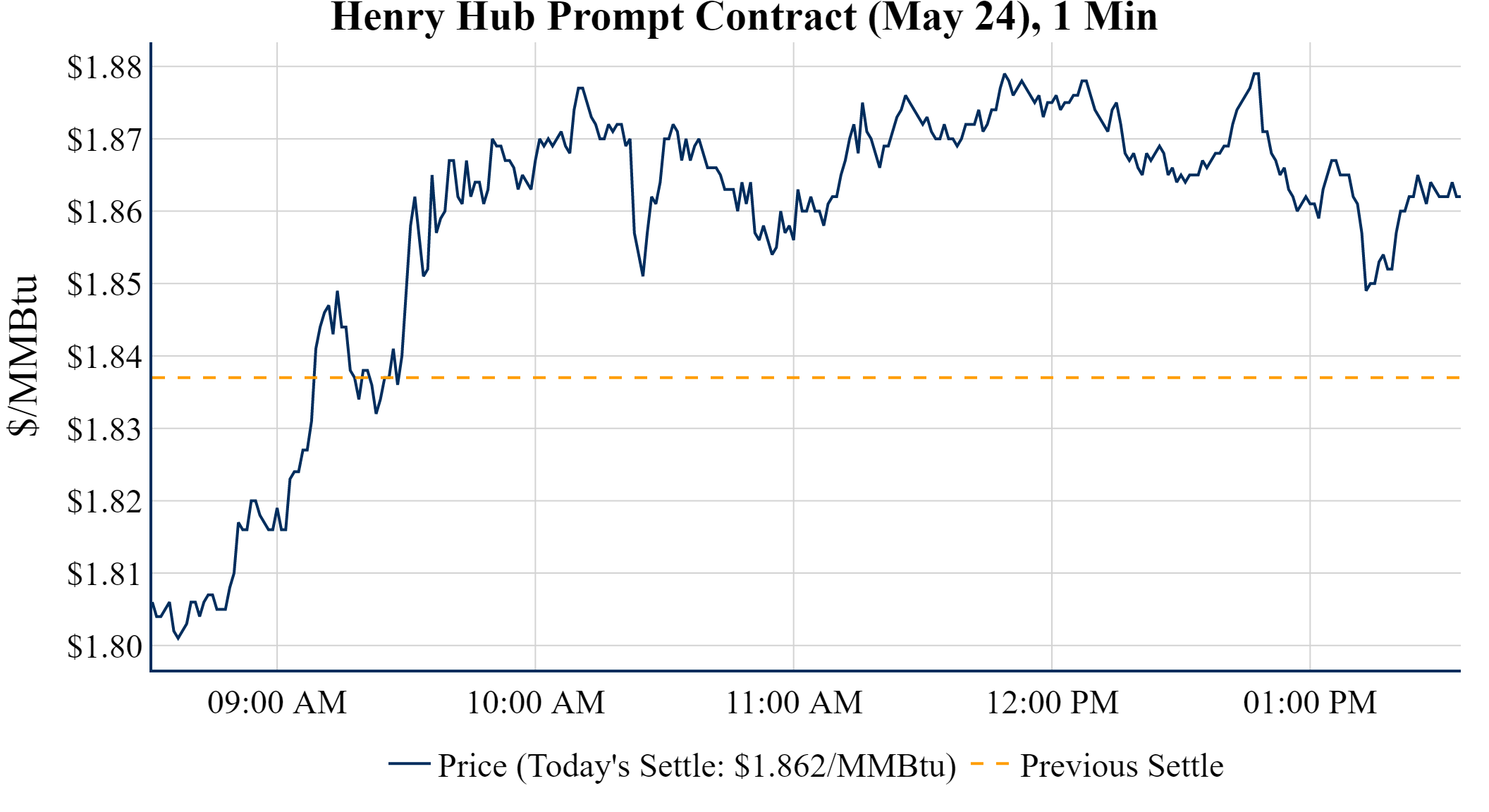 Prompt-Month Henry Hub (May 24) was up $0.025 on the day, to settle at $1.862Prompt-Month WTI (May 24) was up $1.44 on the day, to settle at $85.15