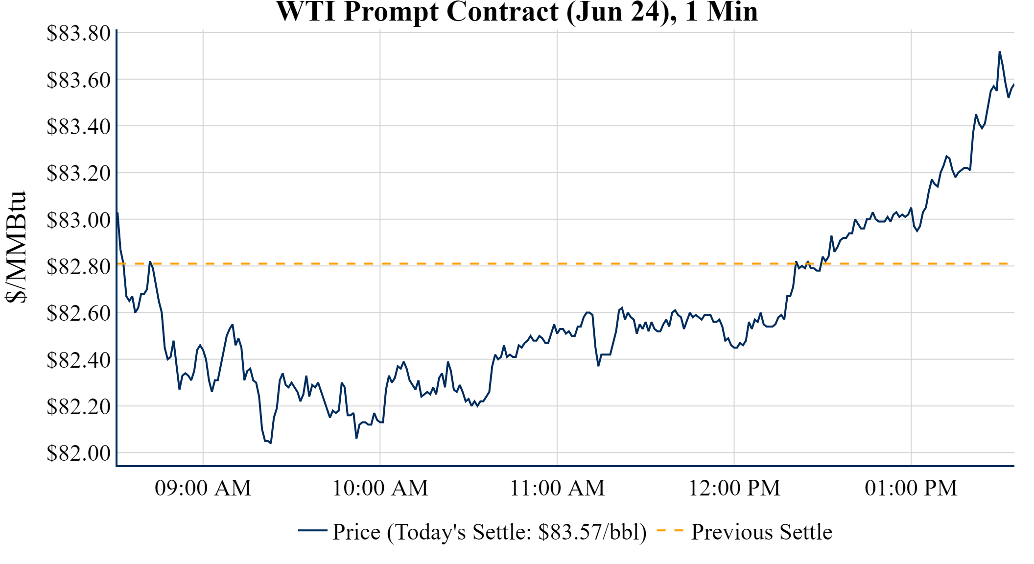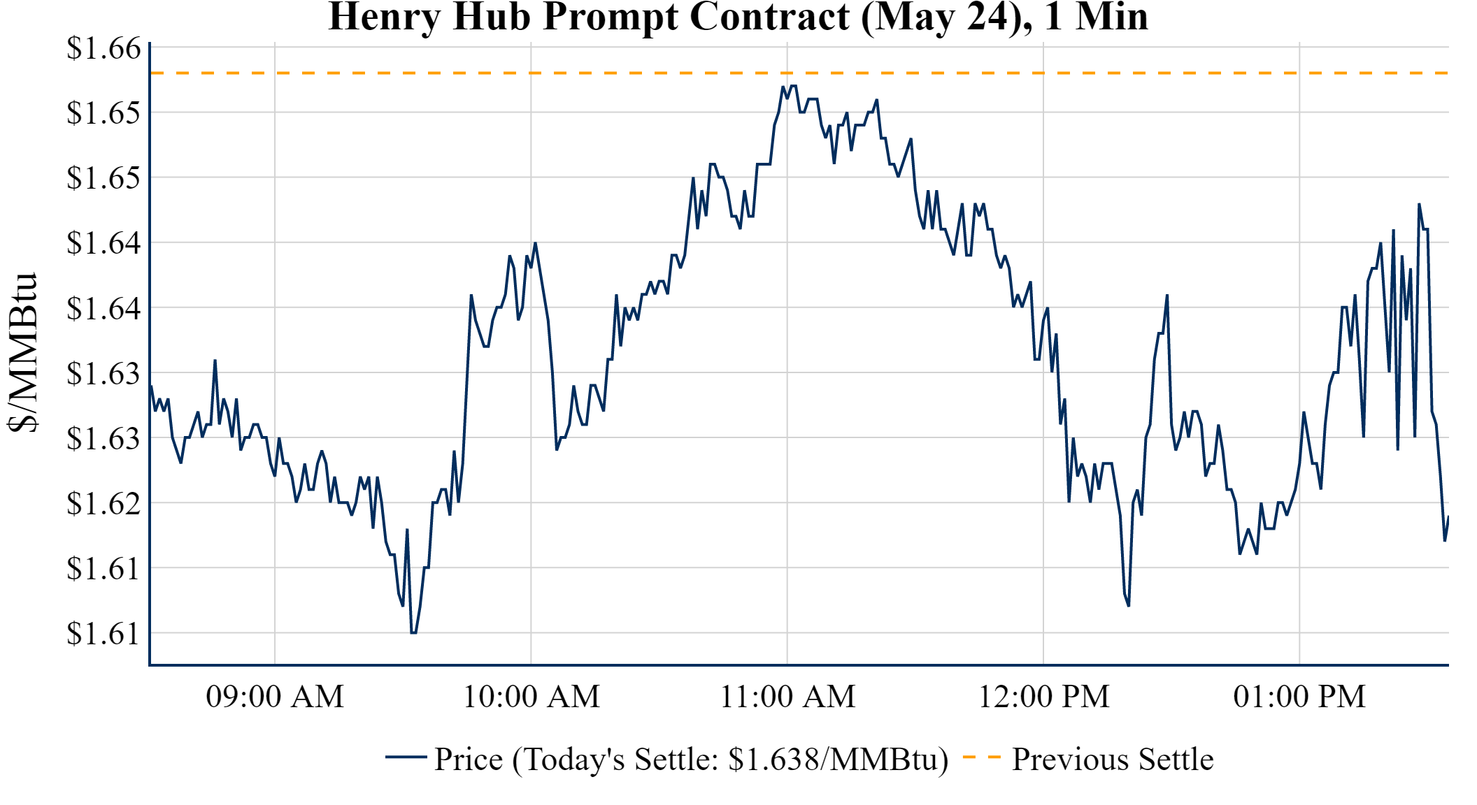 Prompt-Month Henry Hub (May 24) was down $-0.015 on the day, to settle at $1.638 Prompt-Month WTI (Jun 24) was up $0.76 on the day, to settle at $83.57