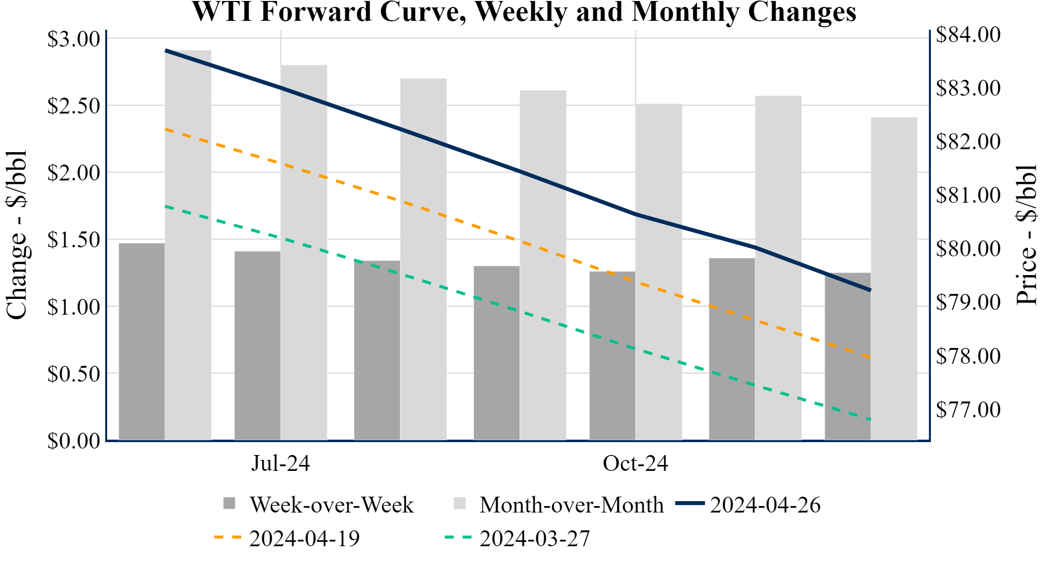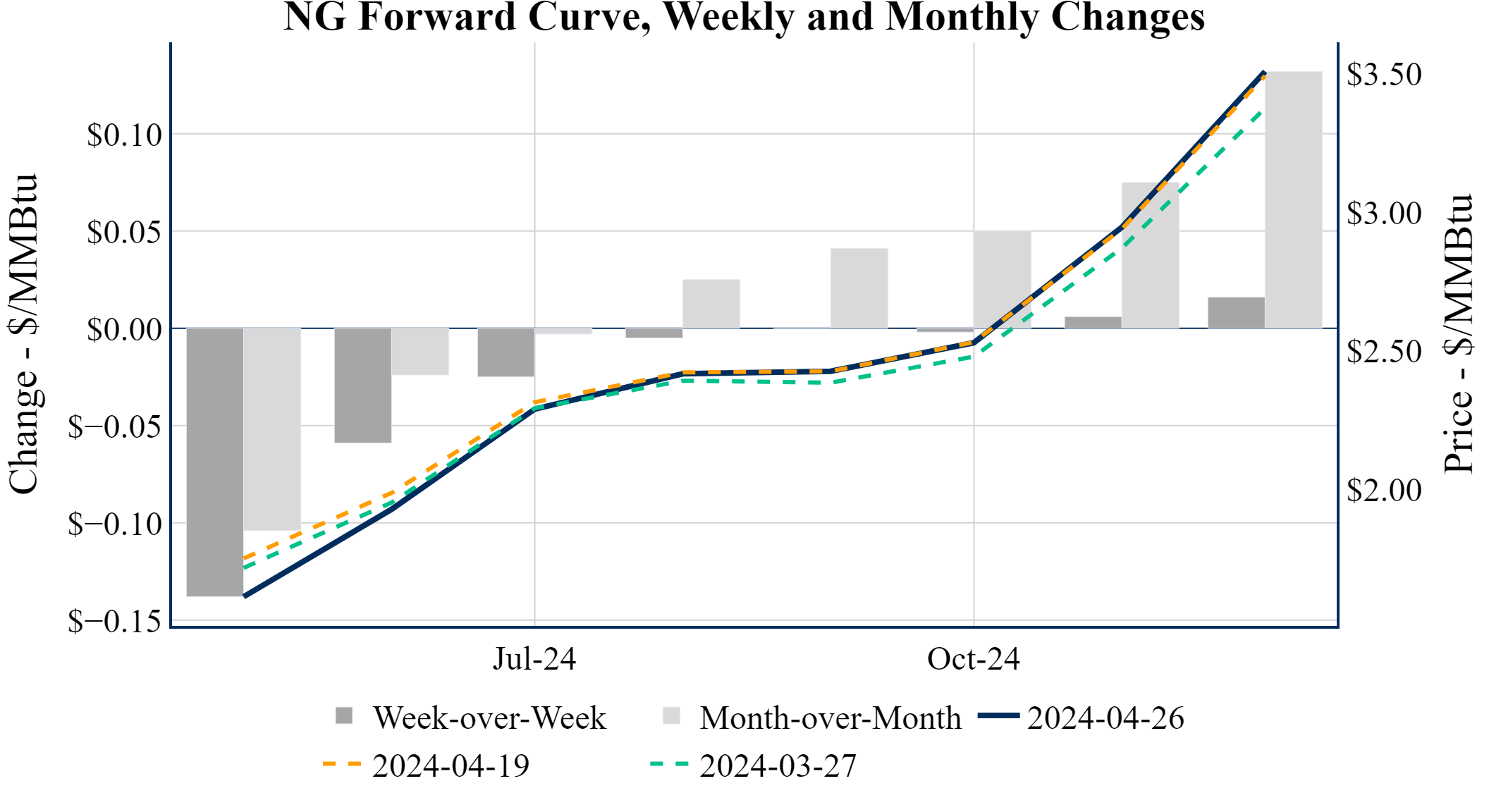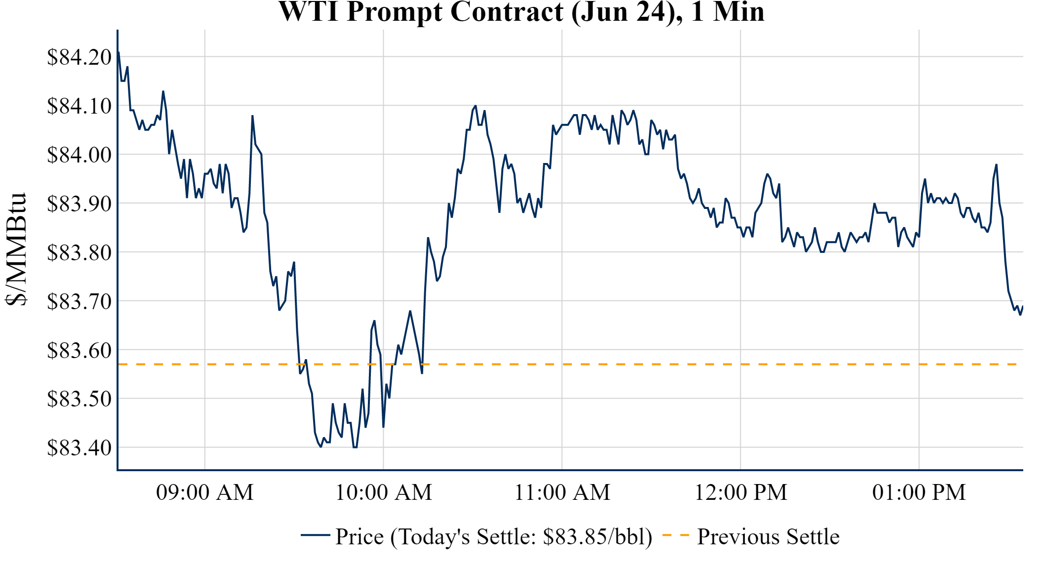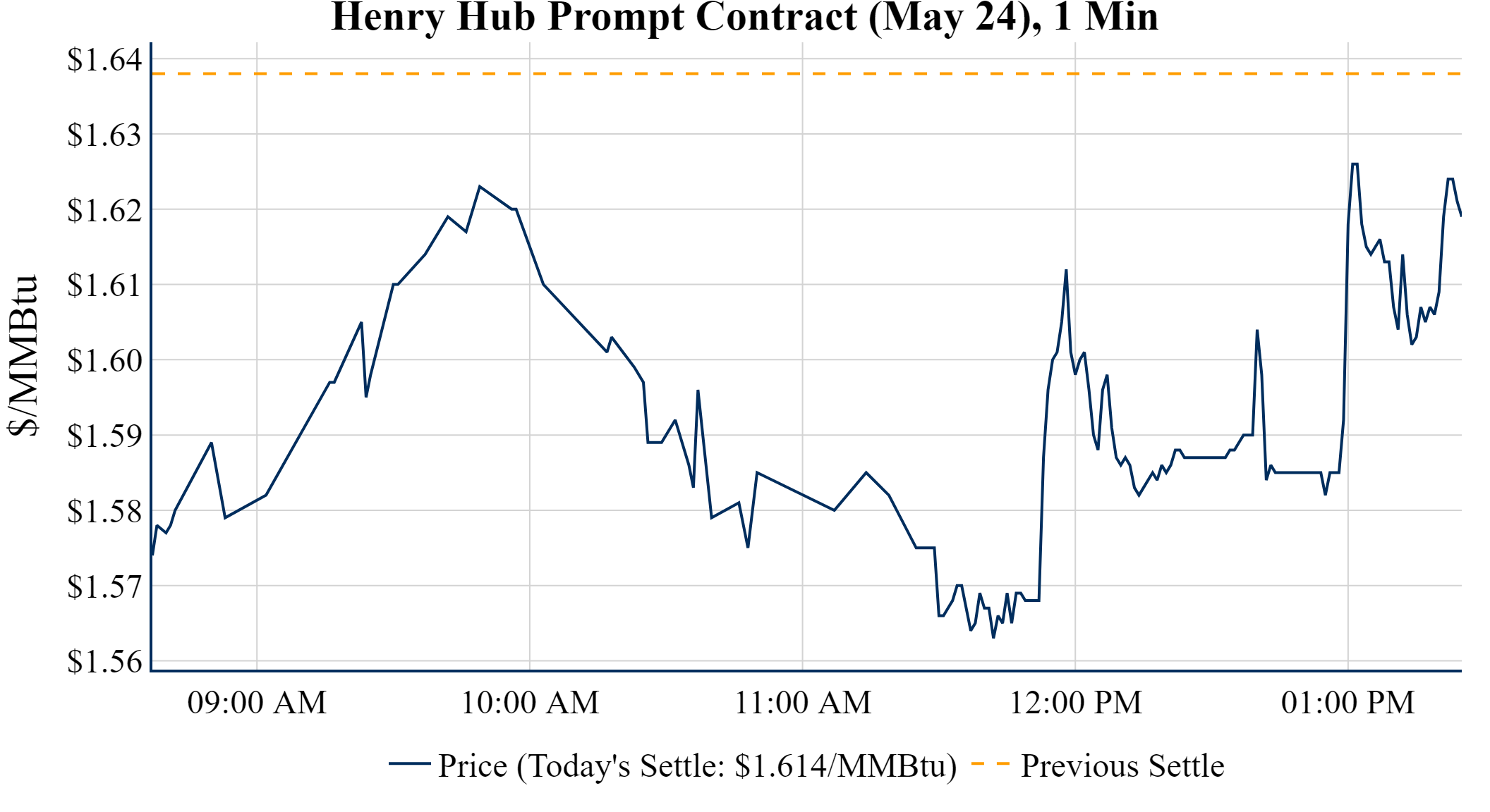 Prompt-Month Henry Hub (May 24) was down $-0.024 on the day, to settle at $1.614 Prompt-Month WTI (Jun 24) was up $0.28 on the day, to settle at $83.85