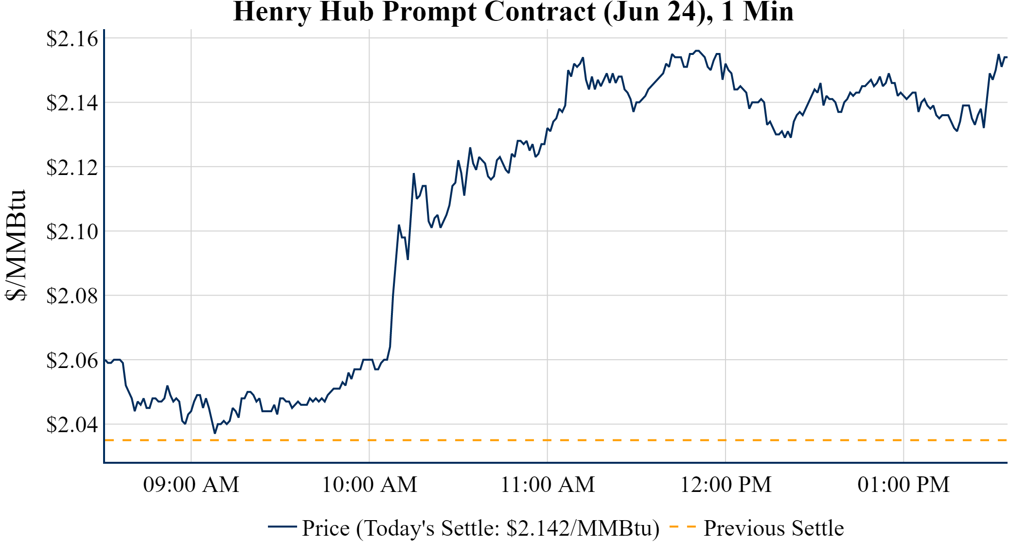 Prompt-Month Henry Hub (Jun 24) was up $0.107 on the day, to settle at $2.142 Prompt-Month WTI (Jun 24) was down $-0.84 on the day, to settle at $78.11