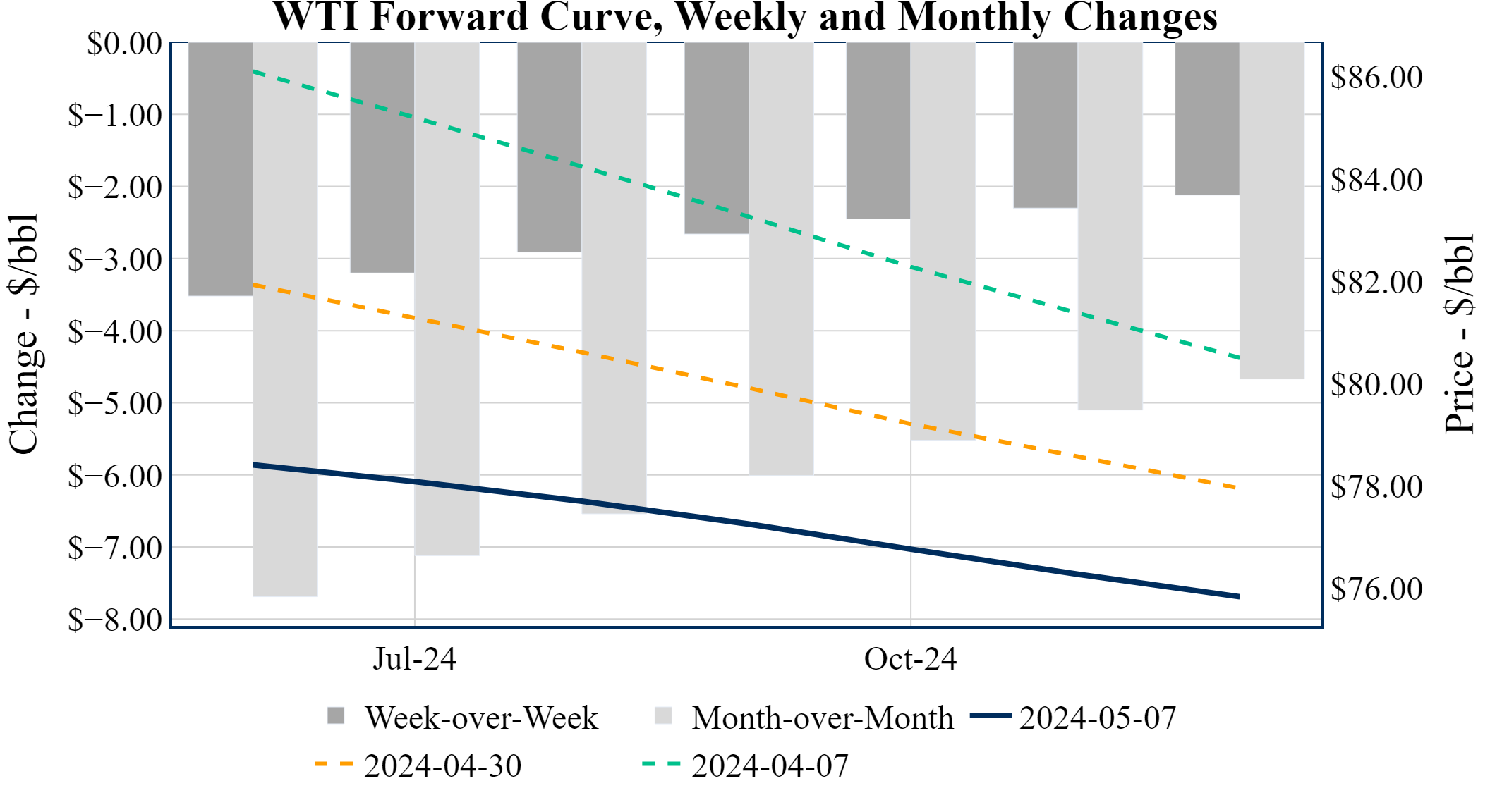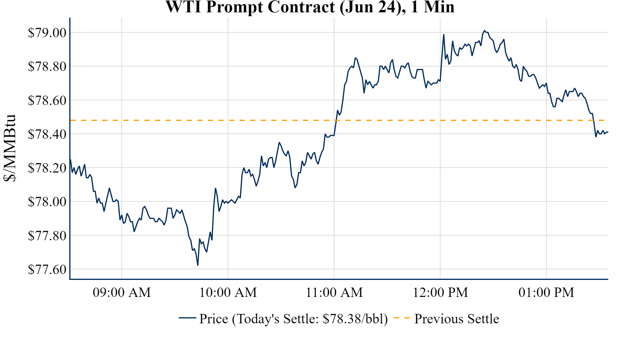 Prompt-Month WTI (Jun 24) was down $-0.10 on the day, to settle at $78.38
