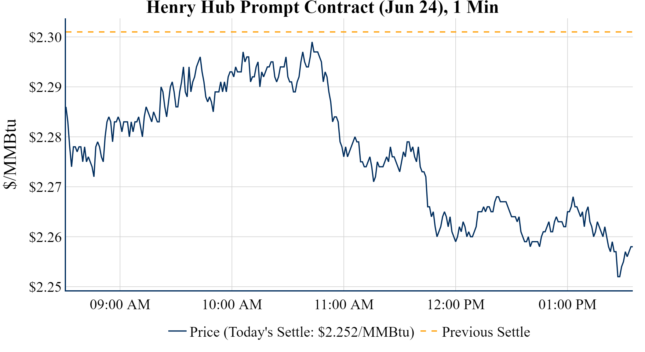 Prompt-Month Henry Hub (Jun 24) was down $-0.049 on the day, to settle at $2.252 Prompt-Month WTI (Jun 24) was down $-1.00 on the day, to settle at $78.26