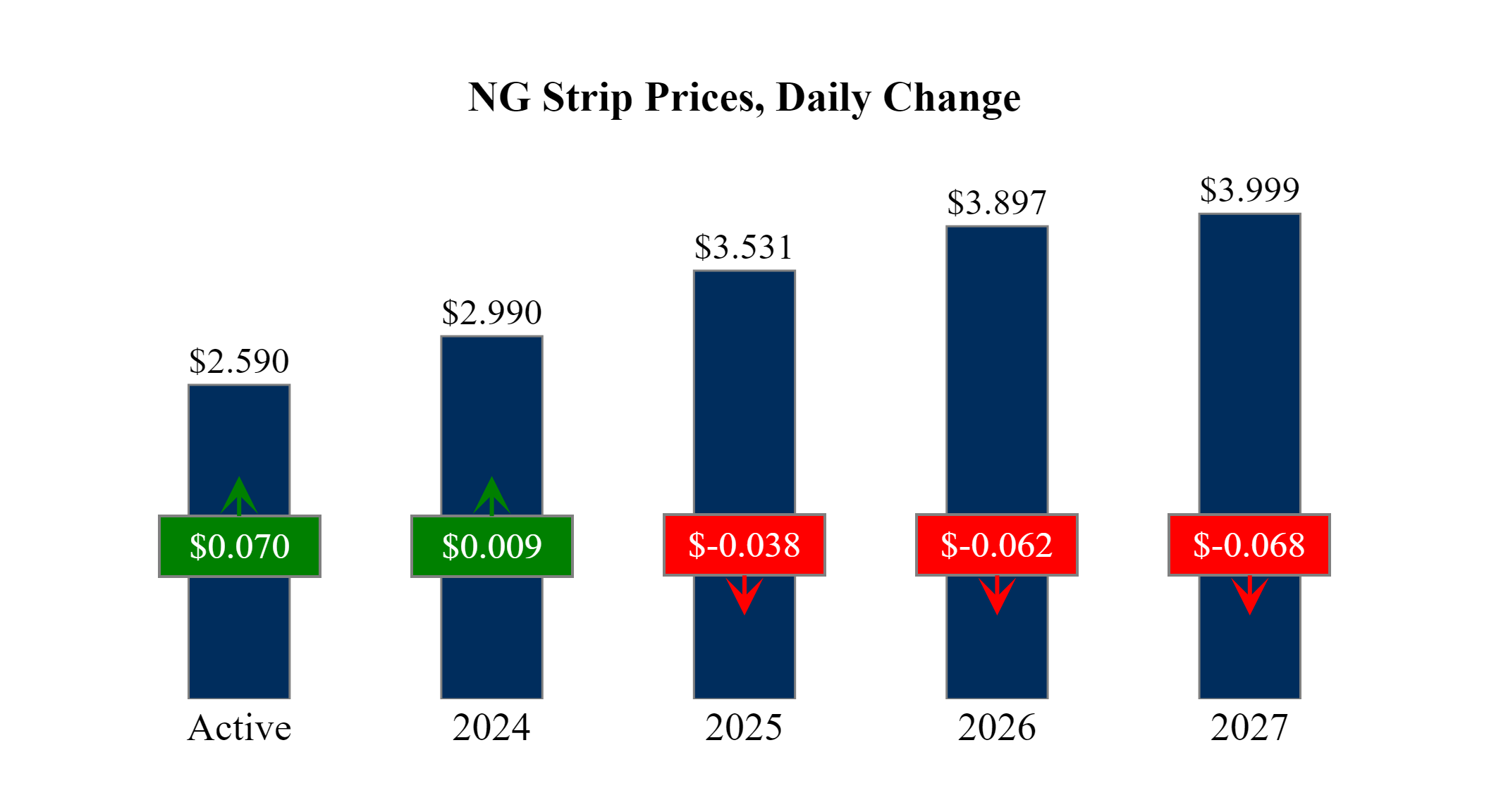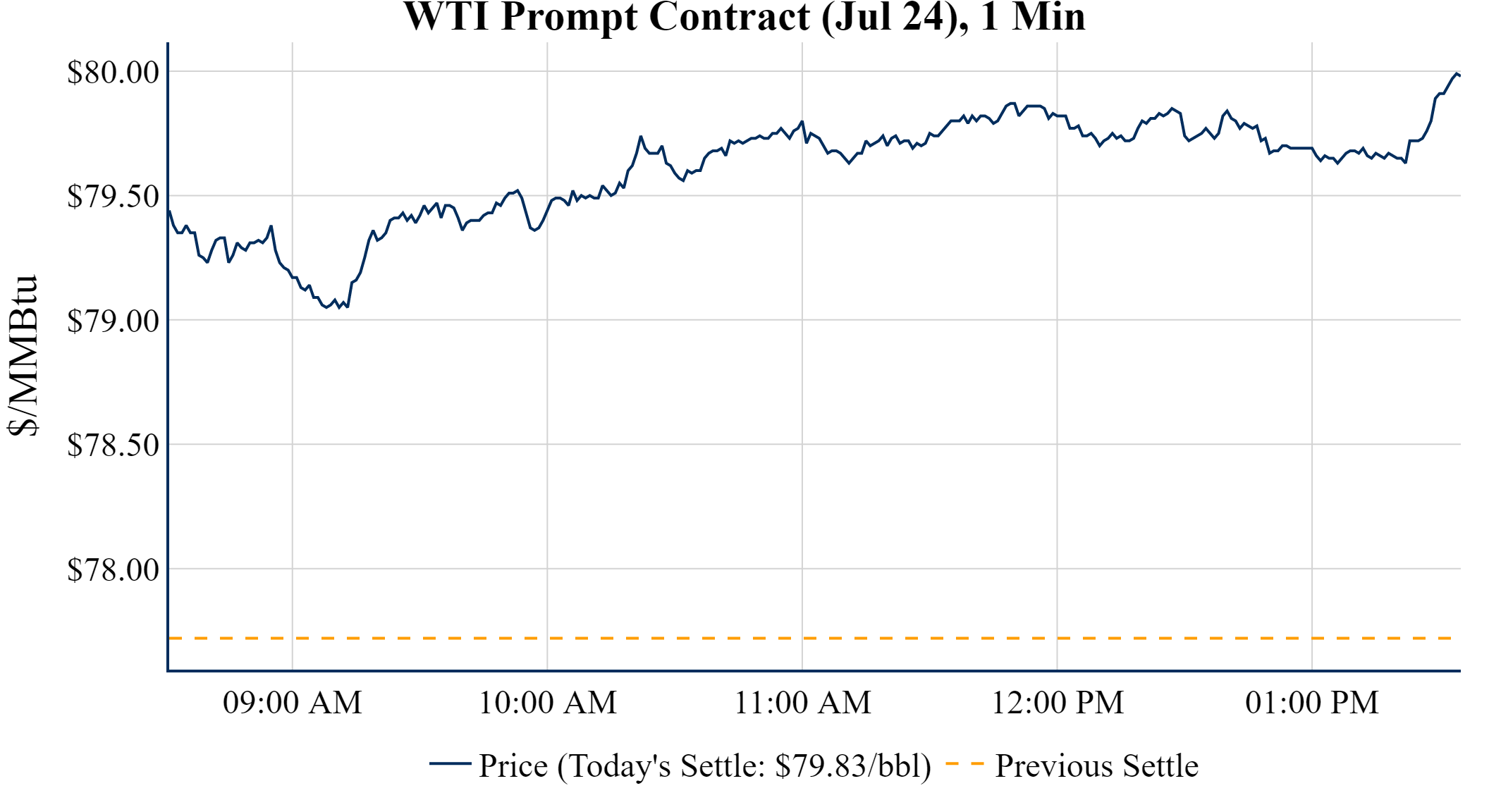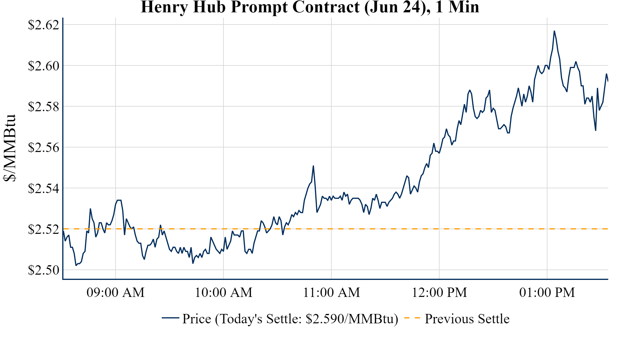 Prompt-Month Henry Hub (Jun 24) was up $0.070 on the day, to settle at $2.590Prompt-Month WTI (Jul 24) was up $2.11 on the day, to settle at $79.83