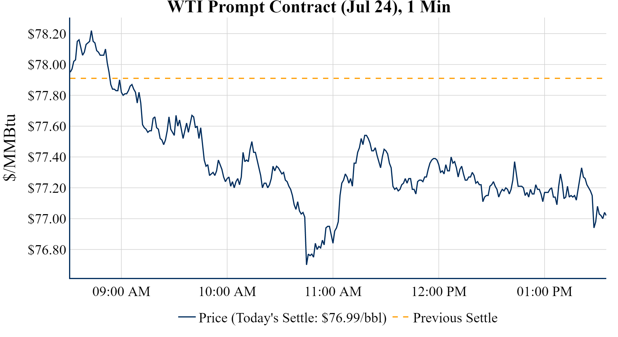 Prompt-Month Henry Hub (Jul 24) was up $0.015 on the day, to settle at $2.587 Prompt-Month WTI (Jul 24) was down $-0.92 on the day, to settle at $76.99