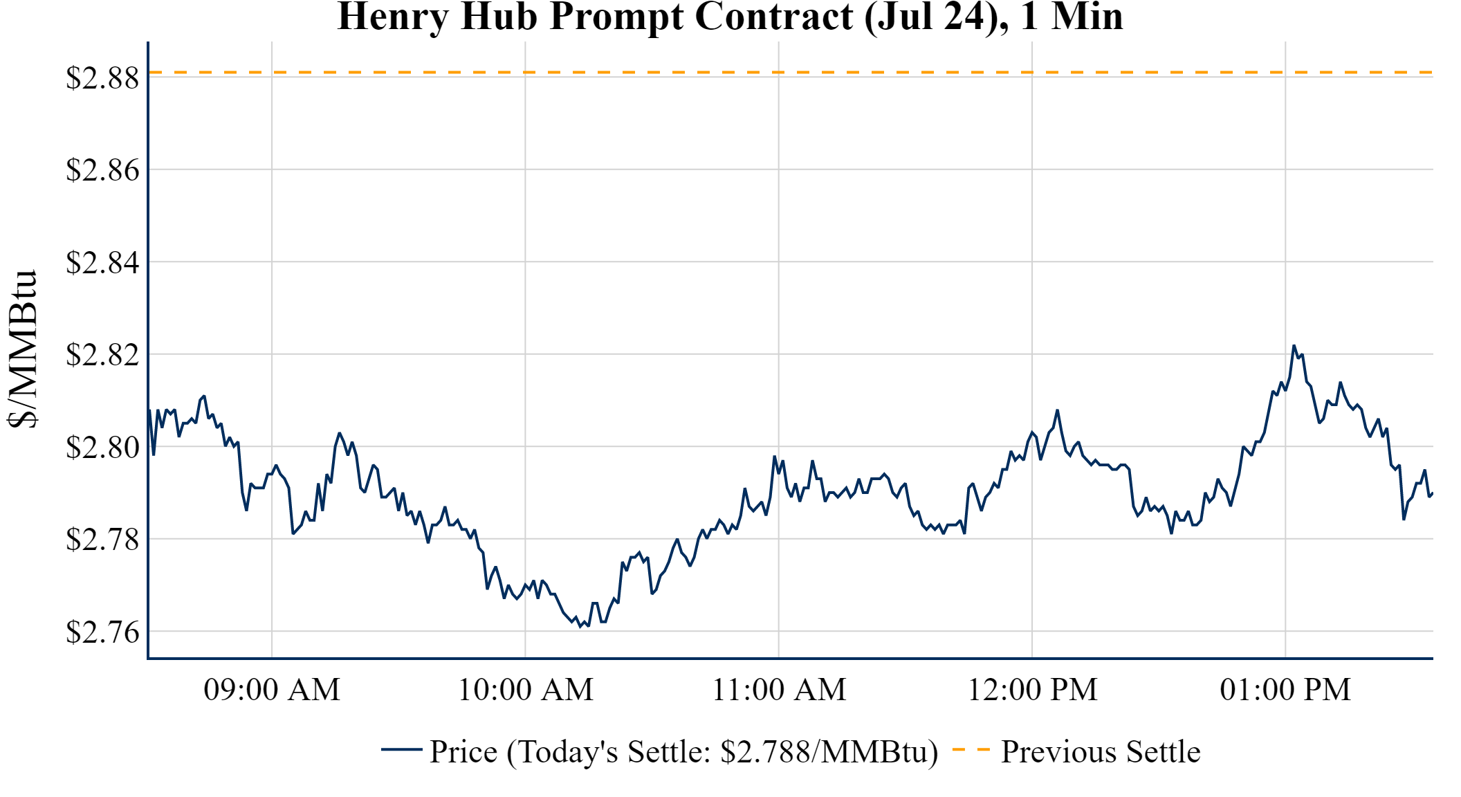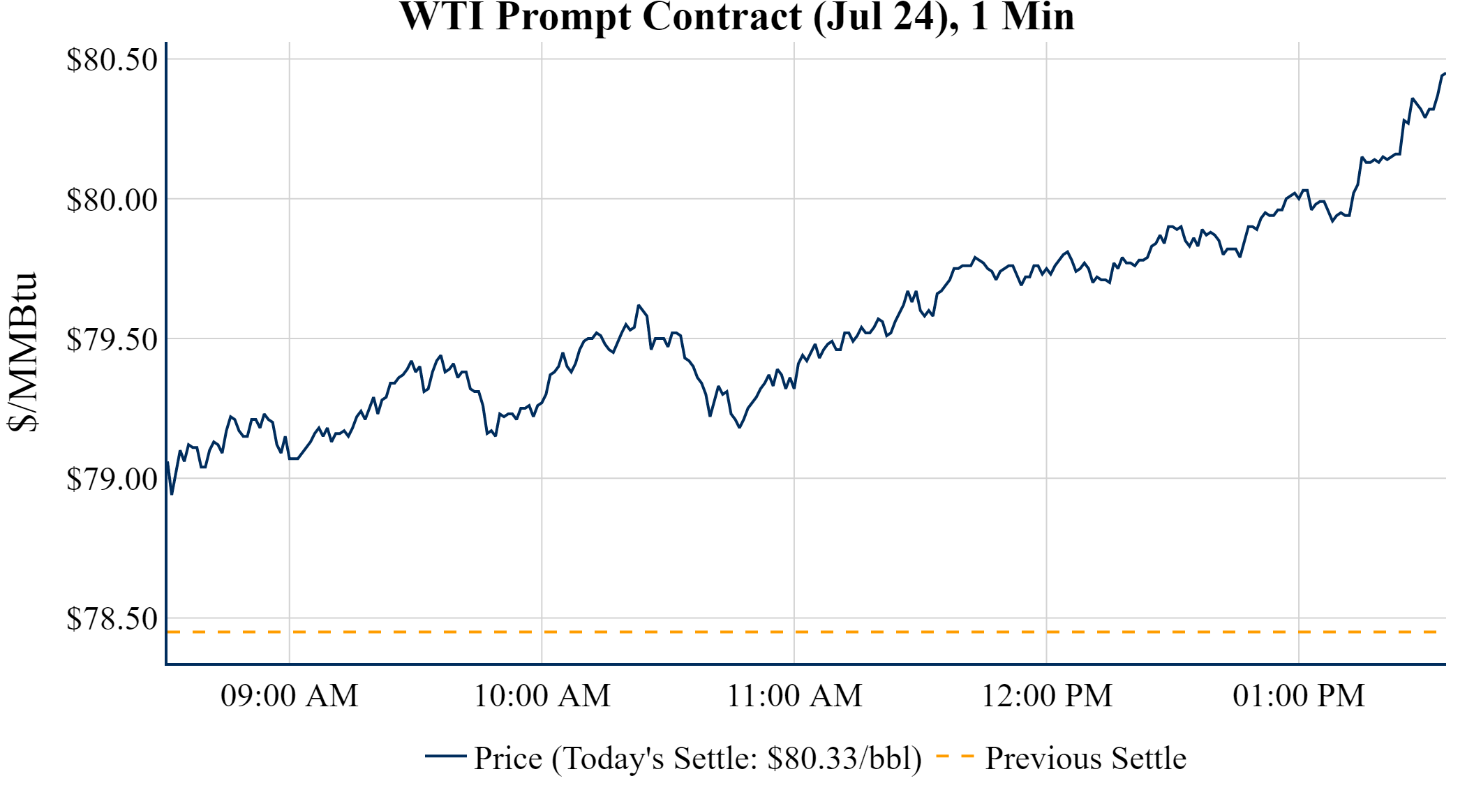 Prompt-Month Henry Hub (Jul 24) was down $-0.093 on the day, to settle at $2.788 Prompt-Month WTI (Jul 24) was up $1.88 on the day, to settle at $80.33