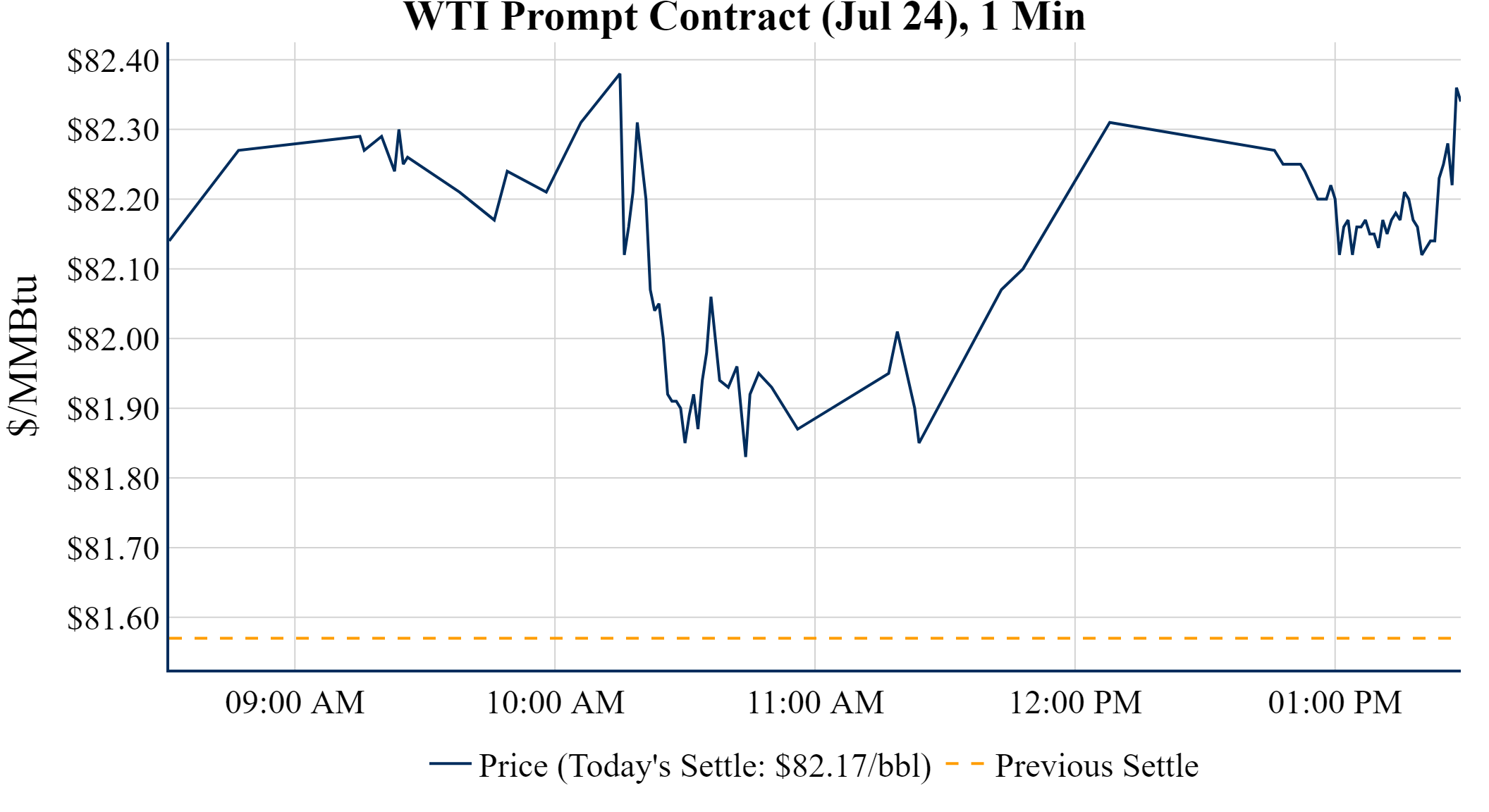 Prompt-Month WTI (Jul 24) was up $0.60 on the day, to settle at $82.17