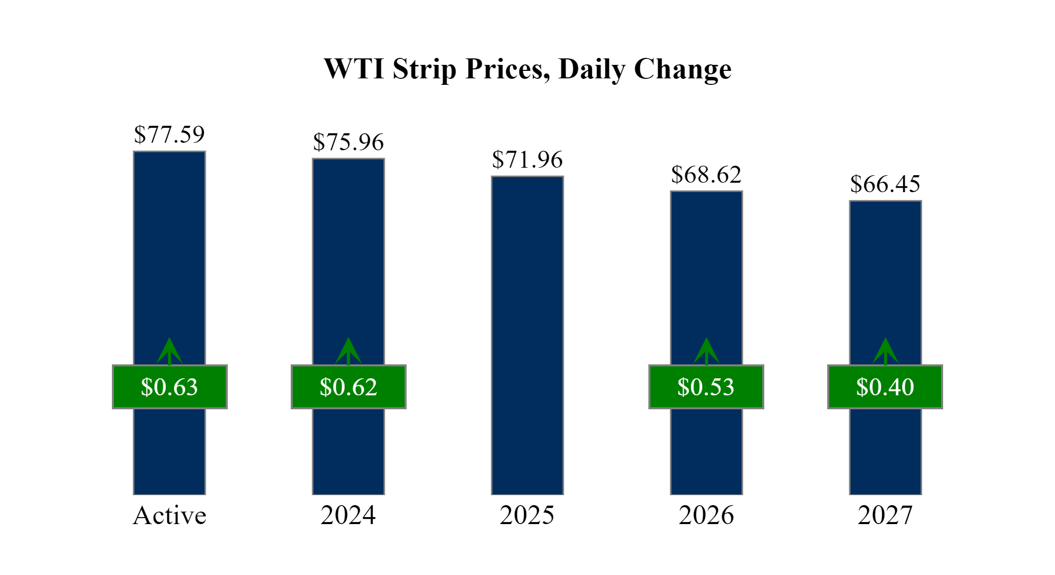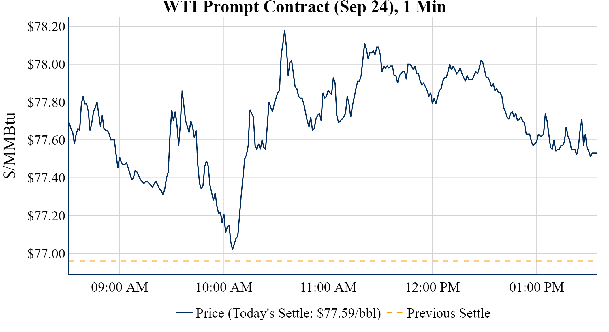 Prompt-Month WTI (Sep 24) was up $0.63 on the day, to settle at $77.59
