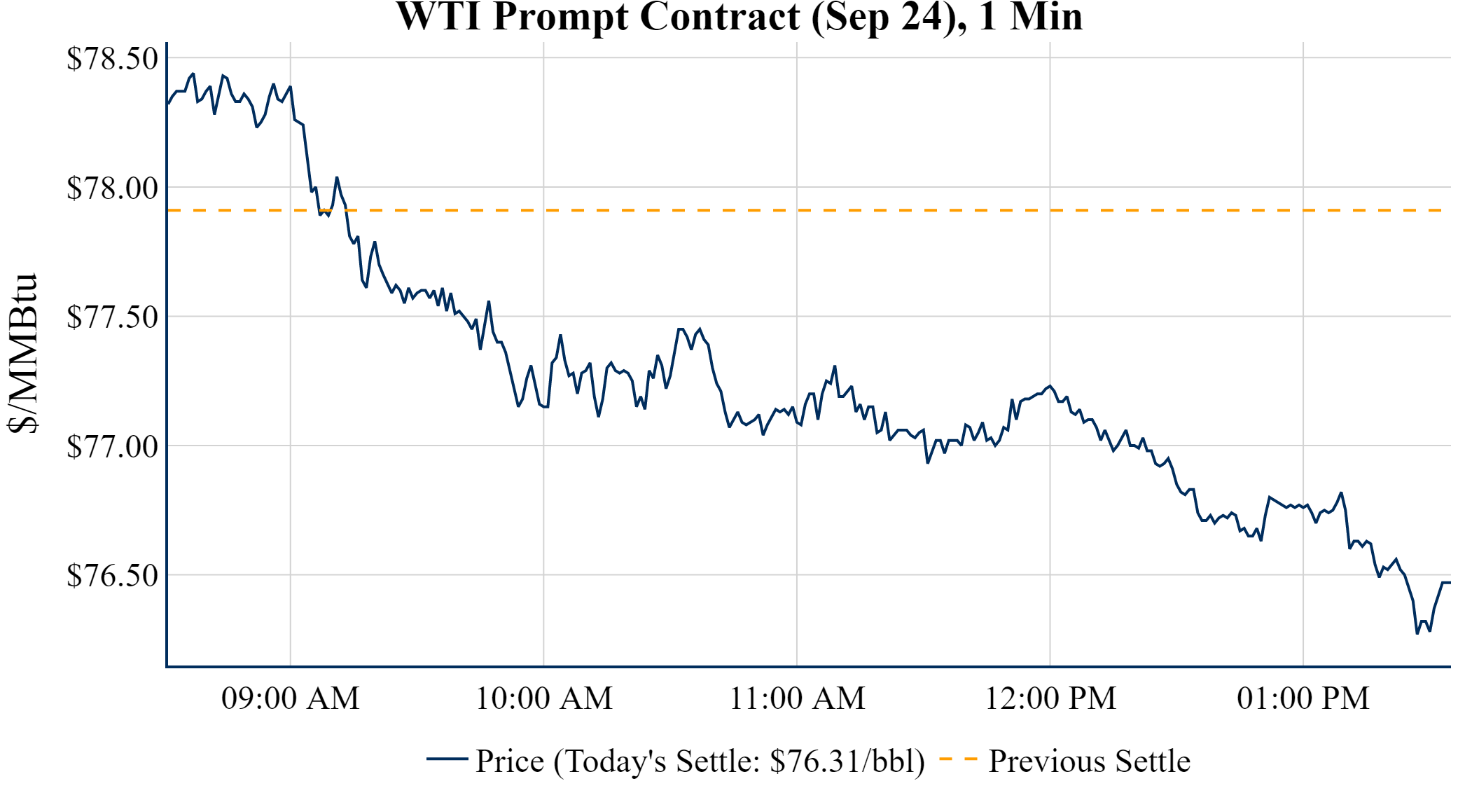 Prompt-Month WTI (Sep 24) was down $-1.60 on the day, to settle at $76.31