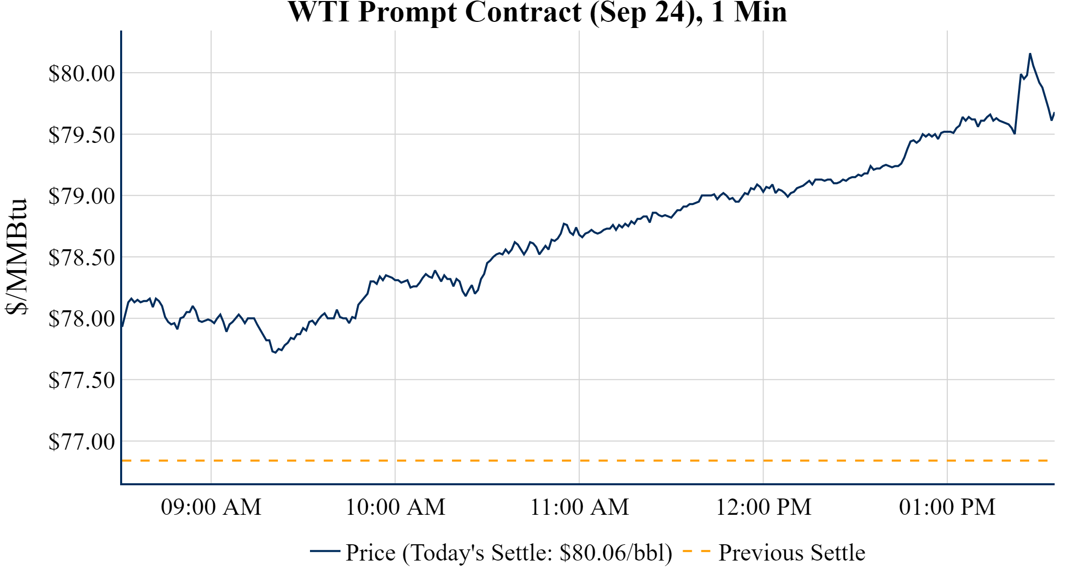 Prompt-Month WTI (Sep 24) was up $3.22 on the day, to settle at $80.06