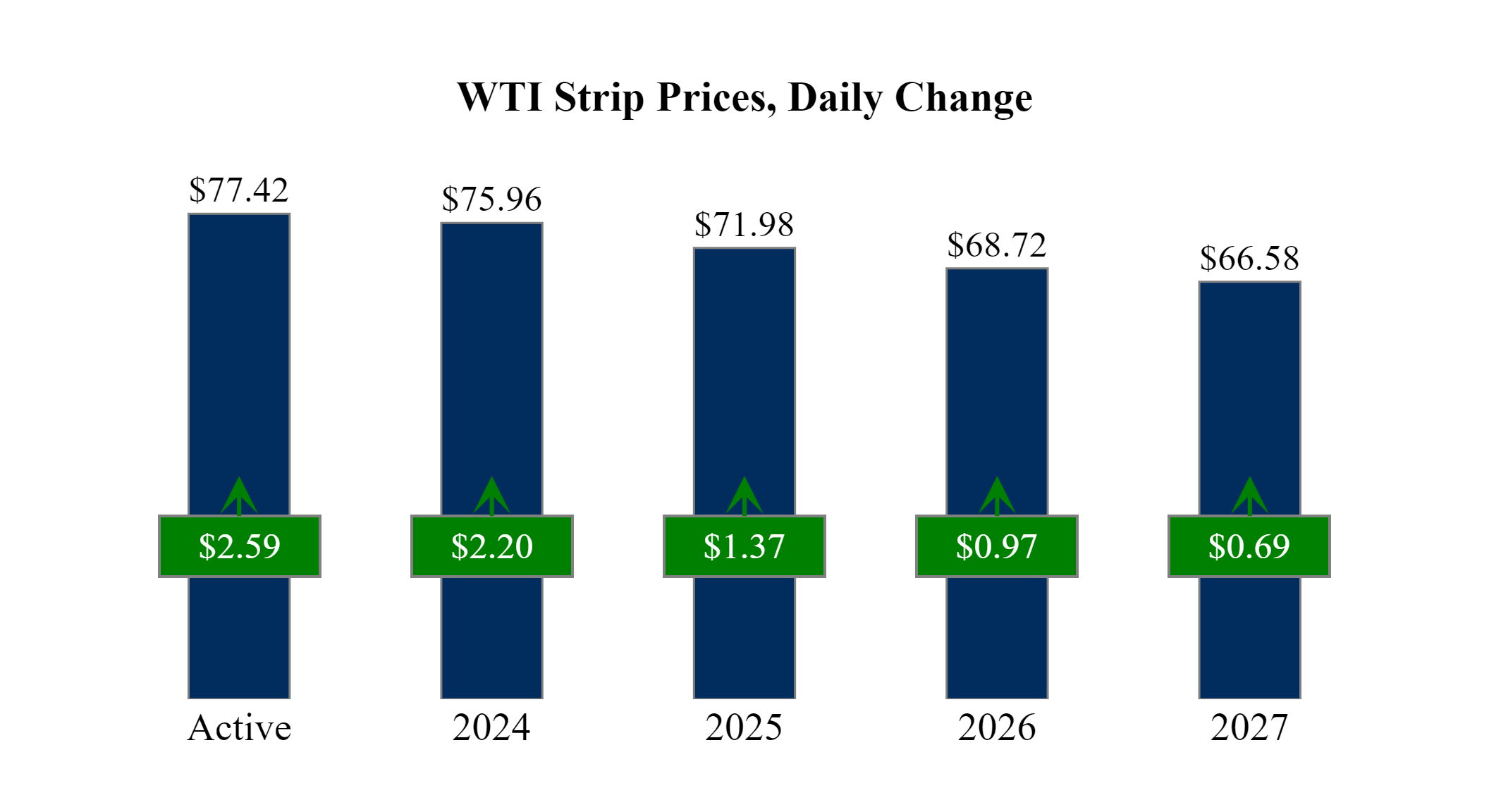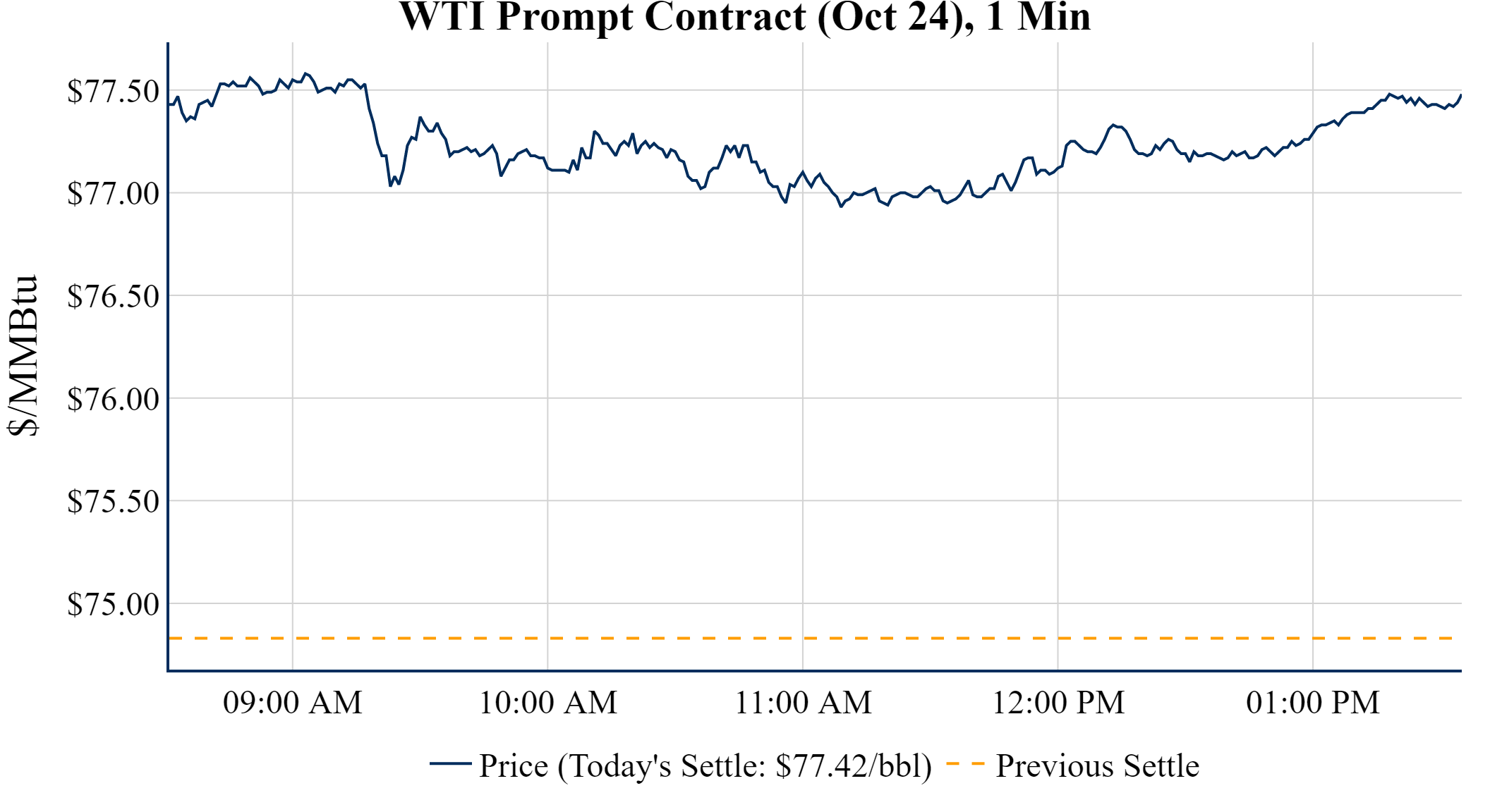 Prompt-Month WTI (Oct 24) was up $2.59 on the day, to settle at $77.42
