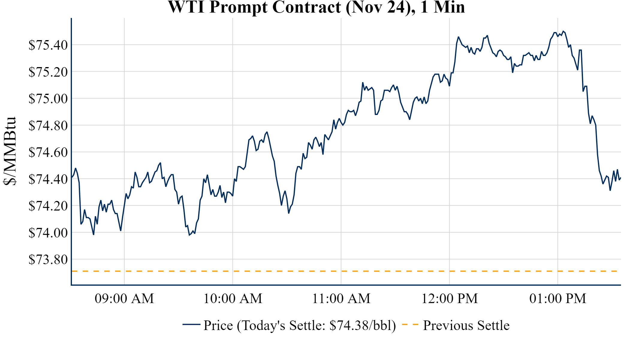 Prompt-Month WTI (Nov 24) was up $0.67 on the day, to settle at $74.38