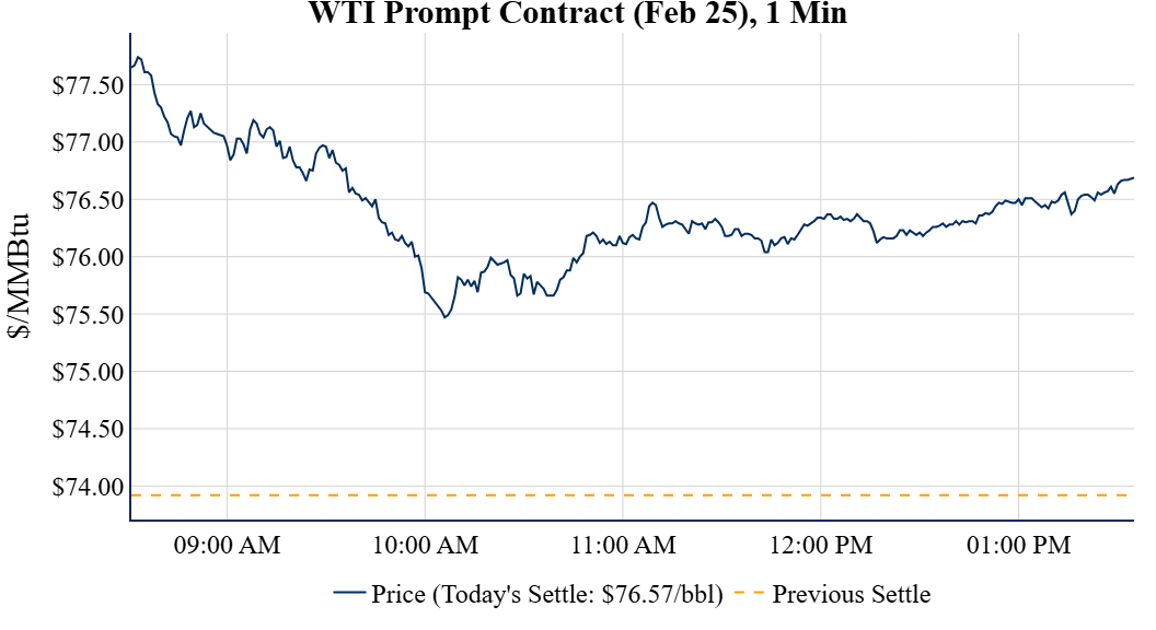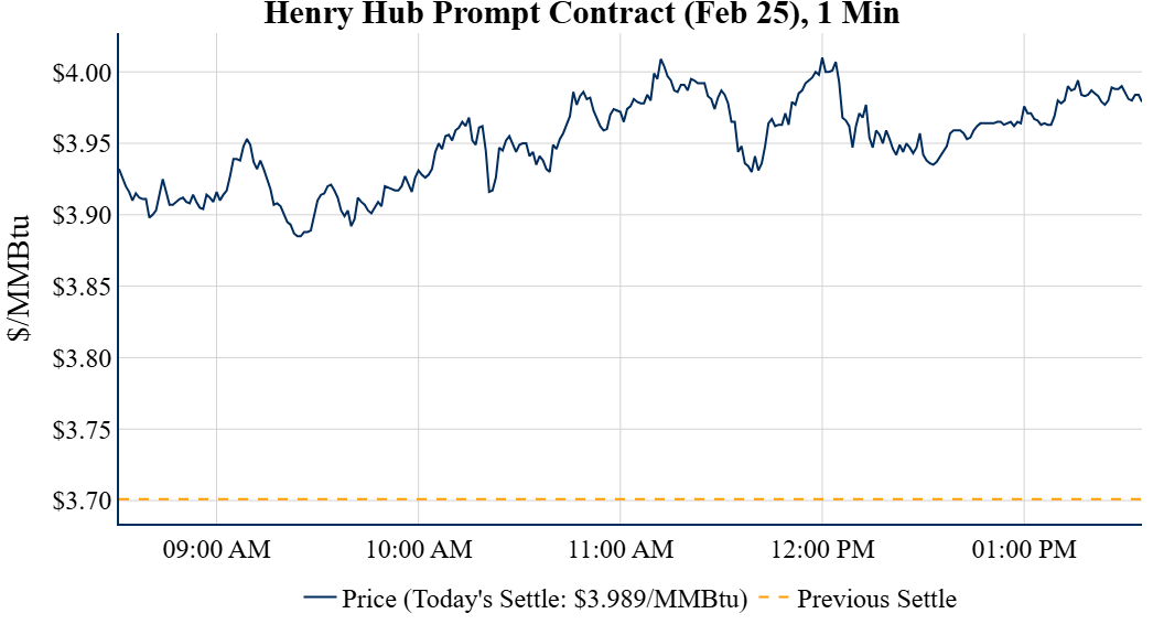 Prompt-Month Henry Hub (Feb 25) was up $0.288 on the day, to settle at $3.989Prompt-Month WTI (Feb 25) was up $2.65 on the day, to settle at $76.57