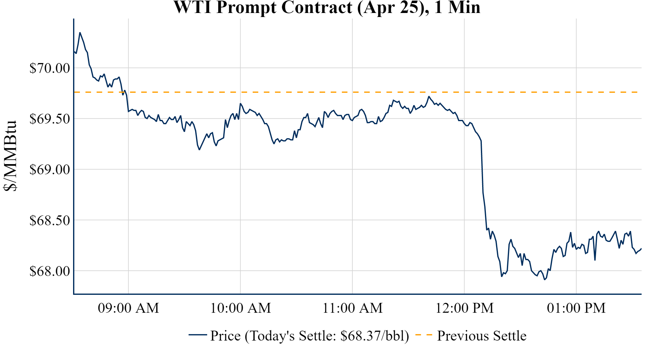 Prompt-Month WTI (April 25) was down $1.39 on the day, to settle at $68.37