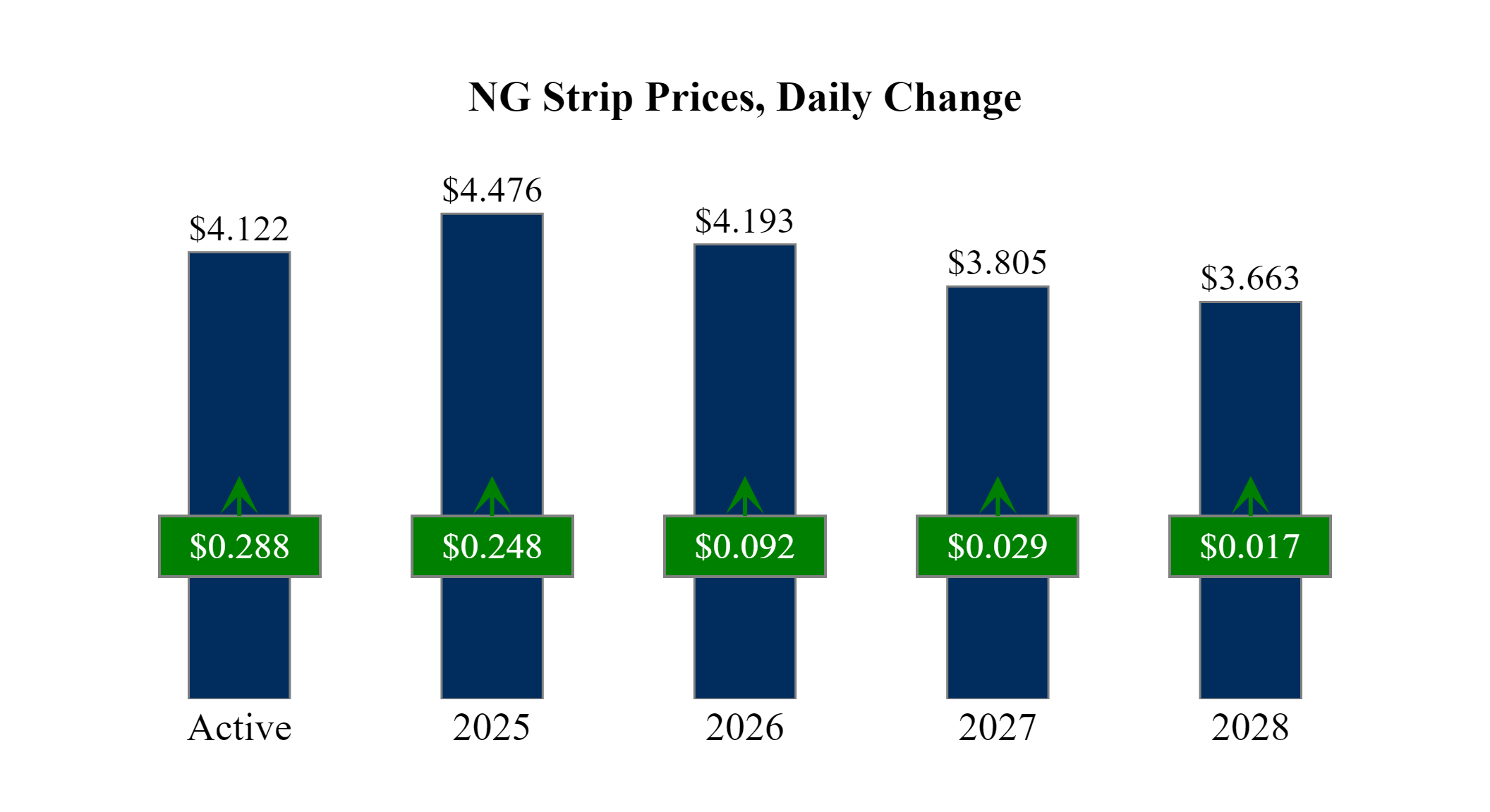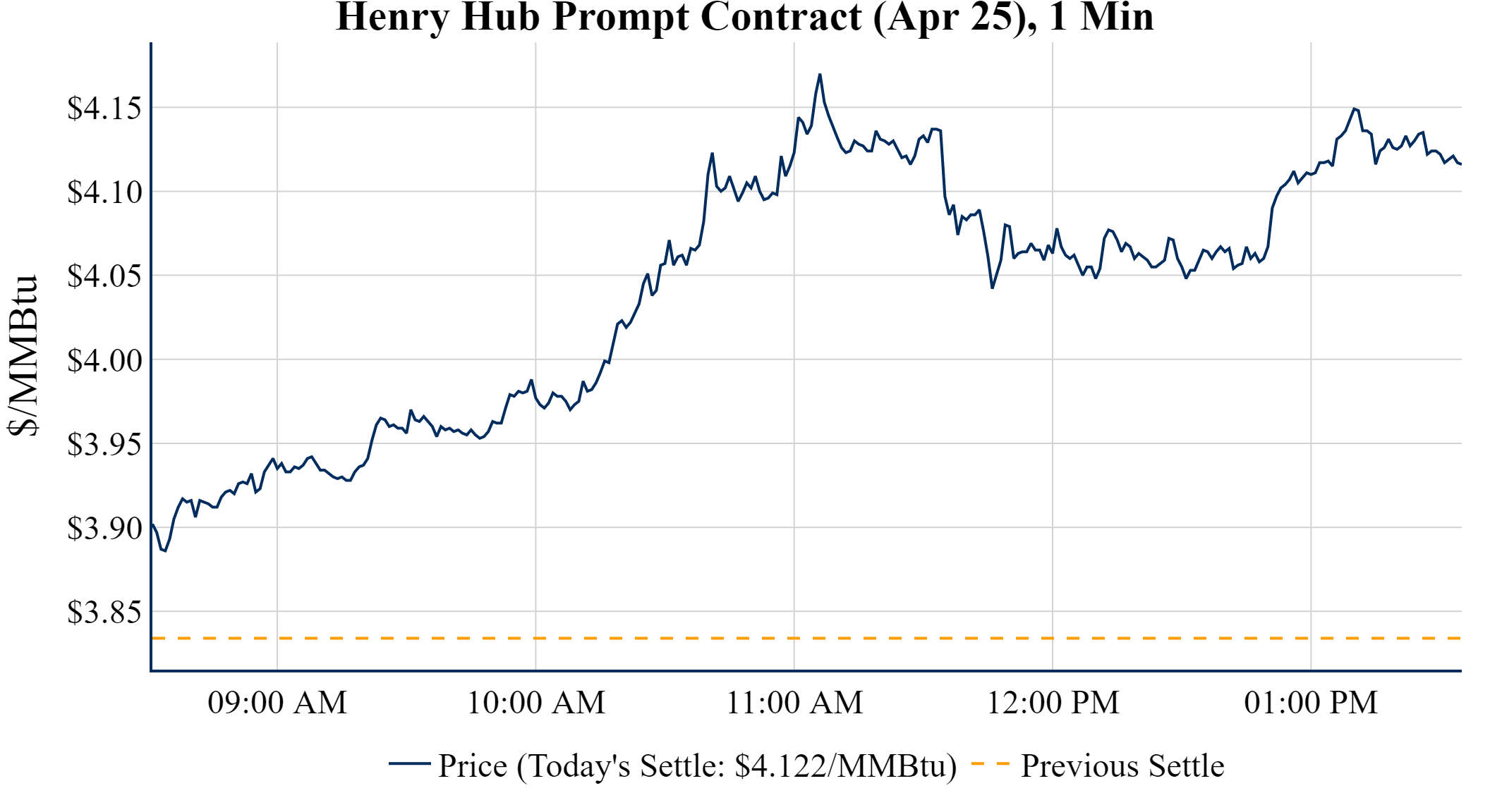 Prompt-Month Henry Hub (April 25) was up $0.288 on the day, to settle at $4.122