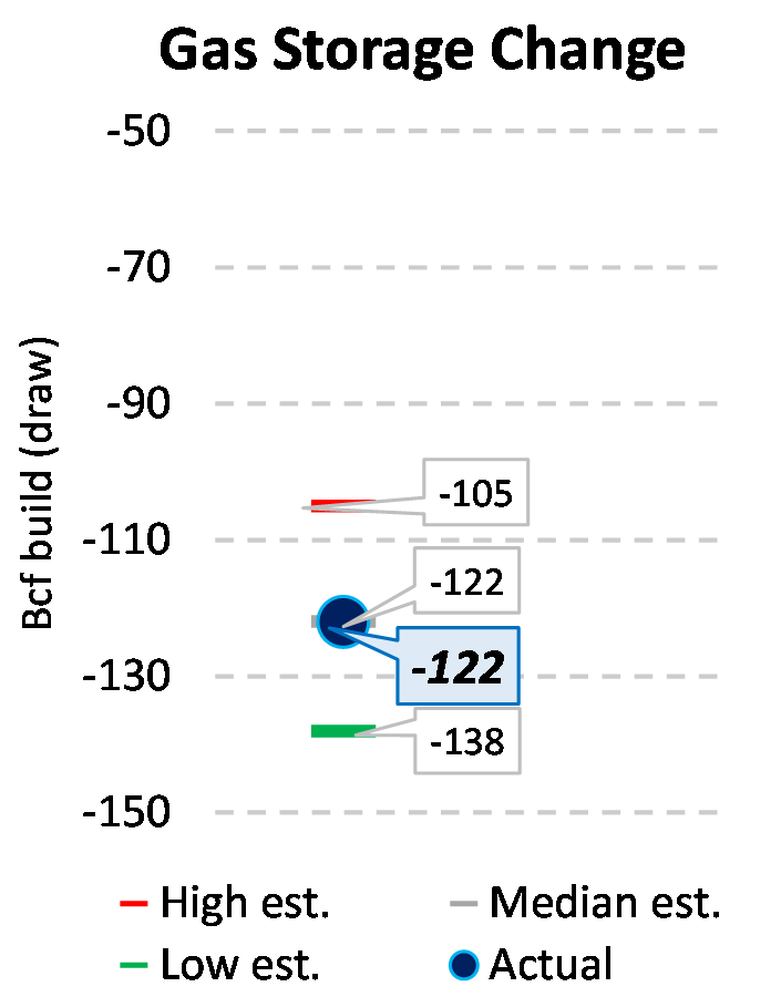 EIA reported a draw of -122 Bcf for the week ending 12/11/2020. This was equal to the median estimate of -122 Bcf. Today's stat fell within the expected range, which was -105 Bcf on the more bearish end, and -138 Bcf on the more bullish end.