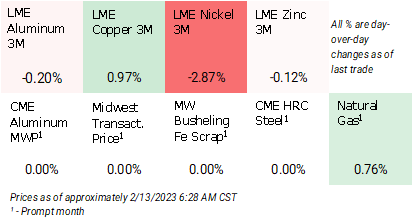 Based on Bloomberg estimates, approximately 270.5 million mt/year of steel is used for the energy transition; however, this volume will jump to almost 1.1 billion mt/year by 2050. Similarly, copper usage for the energy transition will jump nearly six-fold to 38.3 million mt/year, and aluminum demand will grow roughly five-fold to 80.3 million mt/year. (Source: Bloomberg) AEGIS believes that those directly involved or affected by this energy transition will likely require hedging strategies involving both LME and CME metals. These tactics might include simple strategies such as buying swaps or call options. Please note that some CME & LME metals have no options market (like CME cobalt), and several have options market with low liquidity (such as CME HRC steel). Please contact AEGIS for specific strategies that fit your operations. (2/13/2023) |