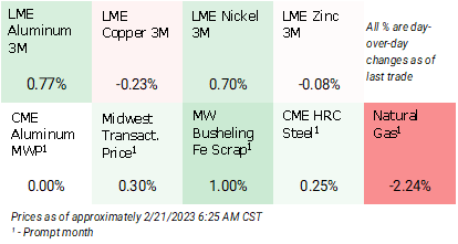 02/15/2023: AEGIS Factor Matrices: Most important variables affecting metals prices 02/07/2023: Will Aluminum's Rally Continue? 01/24/2023: Peruvian Protests Could Support Copper Prices 01/11/2023: Nickel Prices Could Remain Volatile Into 2023 |