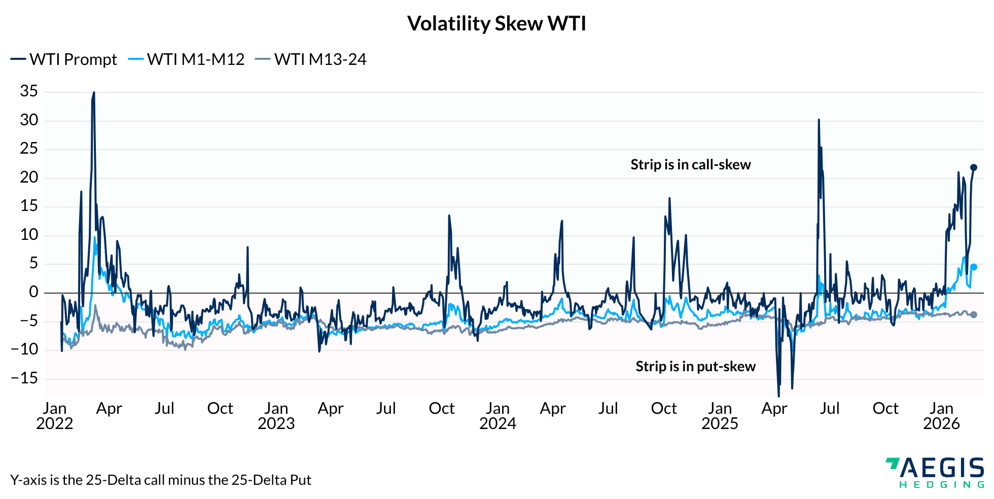 Because crude is typically in put-skew, producers selling calls as part of collar structures often receive less premium relative to the cost of downside protection. That dynamic has temporarily flipped.