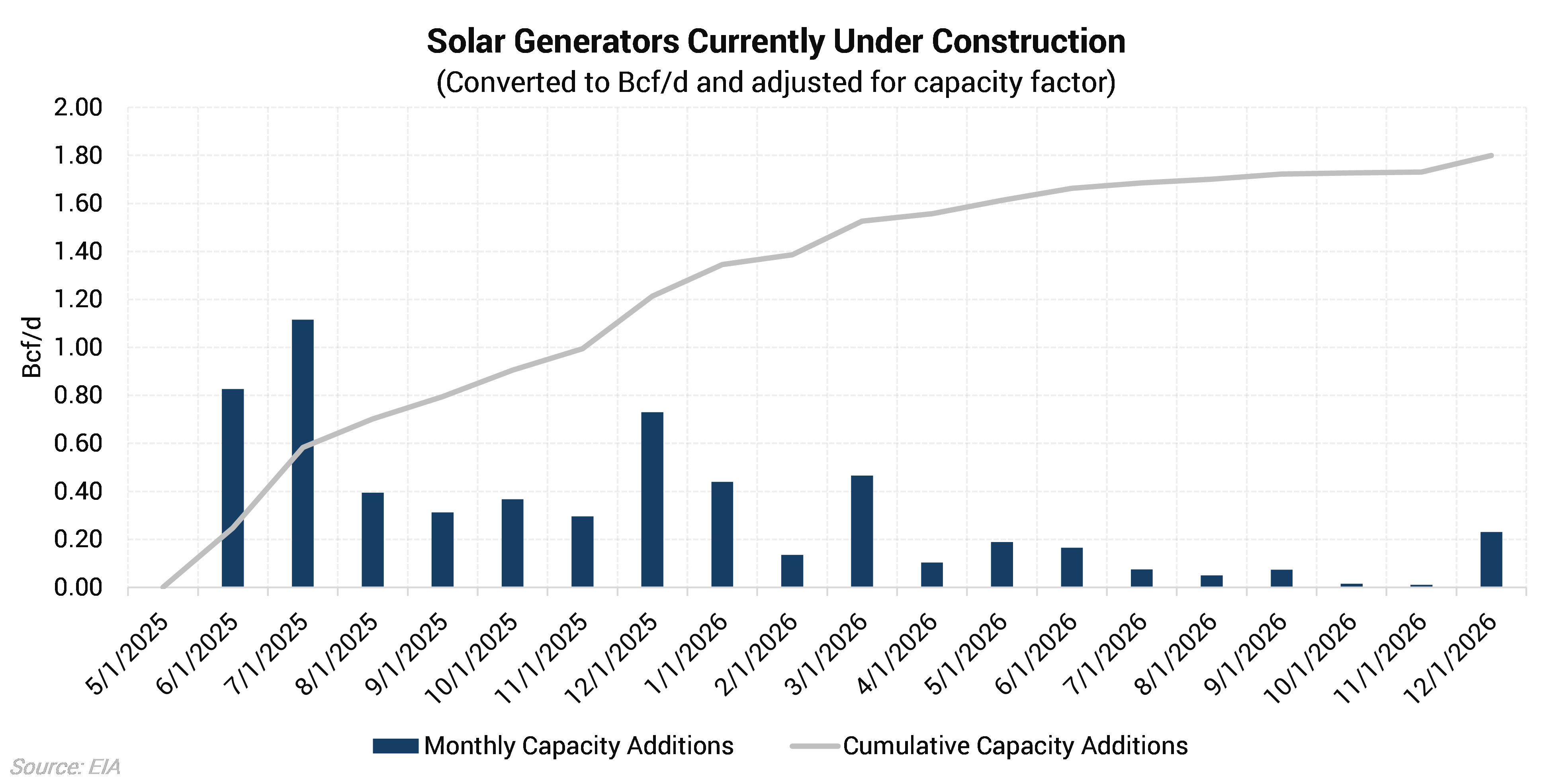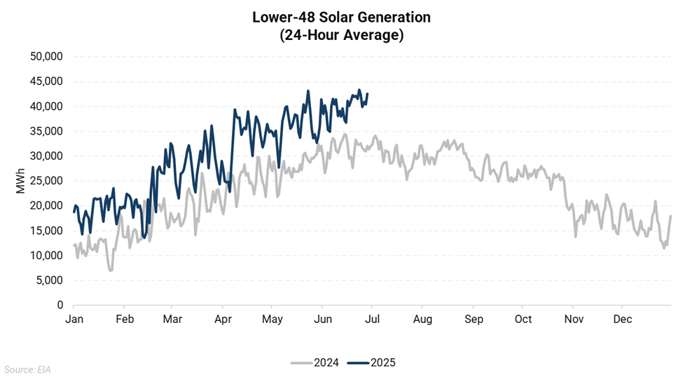 Lower-48 solar generation has hit multiple records this year, with output nearing 45k MWh. The next several years should see this trend continue, as more solar assets are brought online. This poses a bearish risk to gas prices as solar steals market share away from natural gas peaker plants. This is especially true during peak summer when both power demand and solar generation is highest.