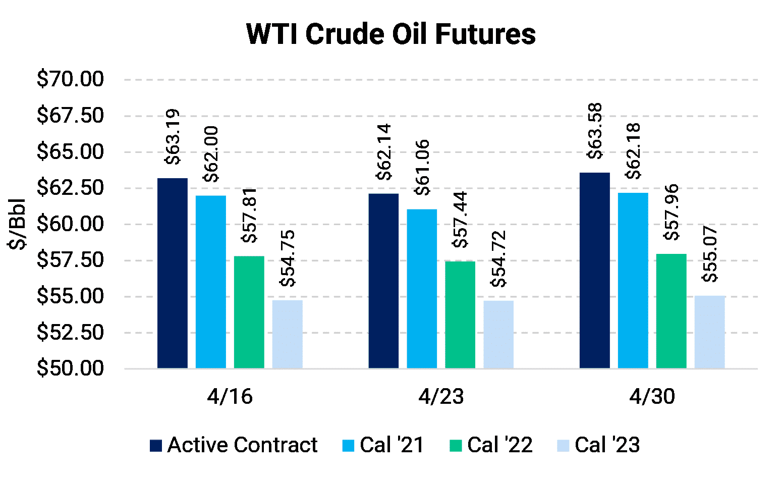 Oil prices gained 2.3% on the week to settle on Friday at $63.58 for the June WTI contract. Market participants appeared more upbeat on the global recovery in demand despite COVID hotspots like India. A report on Wednesday from Goldman Sachs likely helped buoy oil prices as the investment bank reiterated its bullish outlook for oil throughout the year. The bank forecasts Brent will reach $80/Bbl this summer amid rising demand.