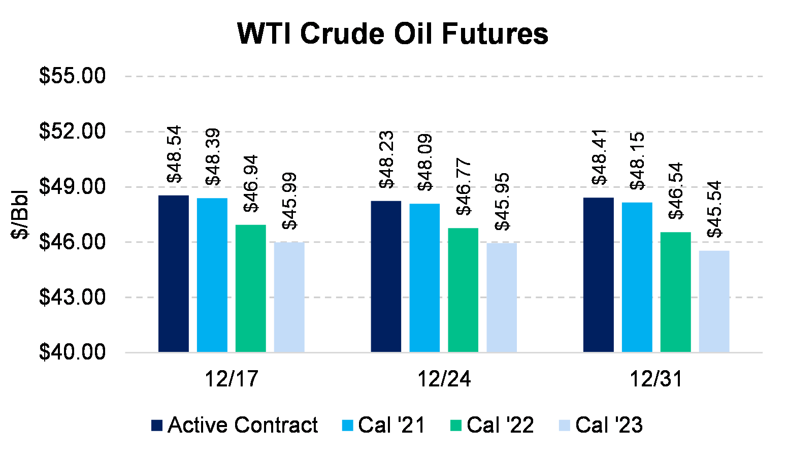 Both major oil and gas benchmarks are going out in 2020 without making much noise. In Thursday's settles, ahead of the New Year's Day holiday tomorrow, most of the gas curve is hardly changed. Summer ($2.65) and next Winter ($2.89) strips were up a few cents. Oil? Similar. The Feb (now prompt) contract rose 25c (to $48.54) from its Christmas Eve close, and the entire Cal 2021 rose 12c.