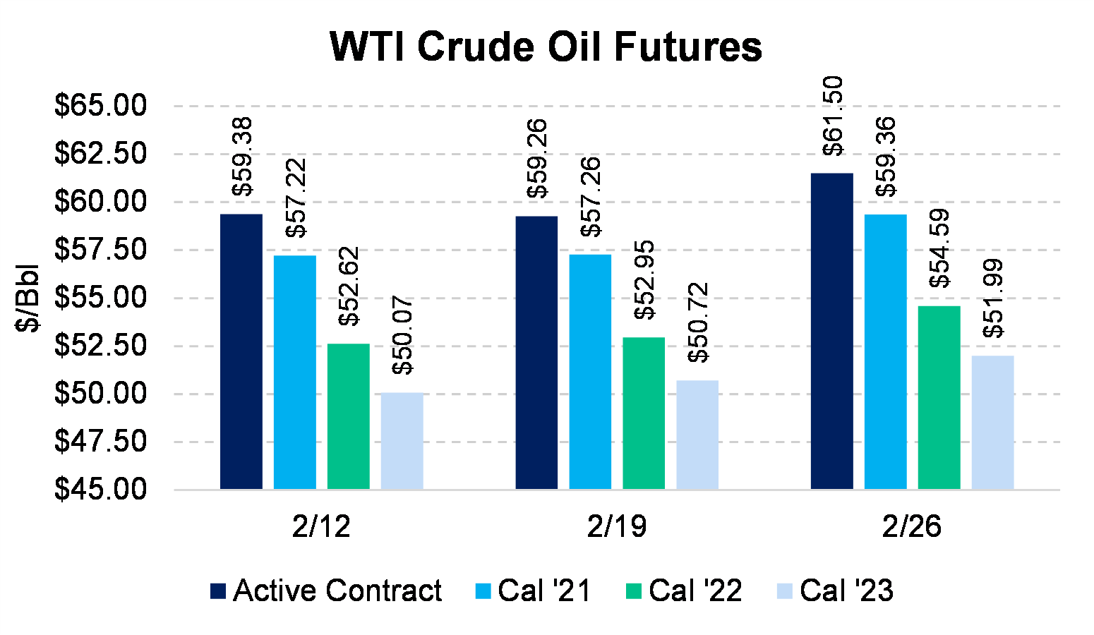 WTI has rallied over 30% since January 1 to $62/Bbl as of February 26 — the largest percentage increase to start a year in at least the past 30 years. You may hold a continued bullish view from current levels, but we recommend taking a hard look at de-risking your portfolio as Bal 2021 trades at $60/Bbl and Cal 2022 at just above $55/Bbl.