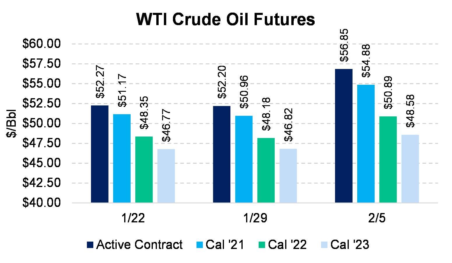 The WTI curve has increased in backwardation as prices in the front of the curve have outpaced those in the back. When backwardation steepens it usually means that the physical market is bid, and demand for crude today is strong. The 12-month March 2021-March 2022 spread was only -$2/Bbl wide a month ago. Now that same spread is -$4.79/Bbl.