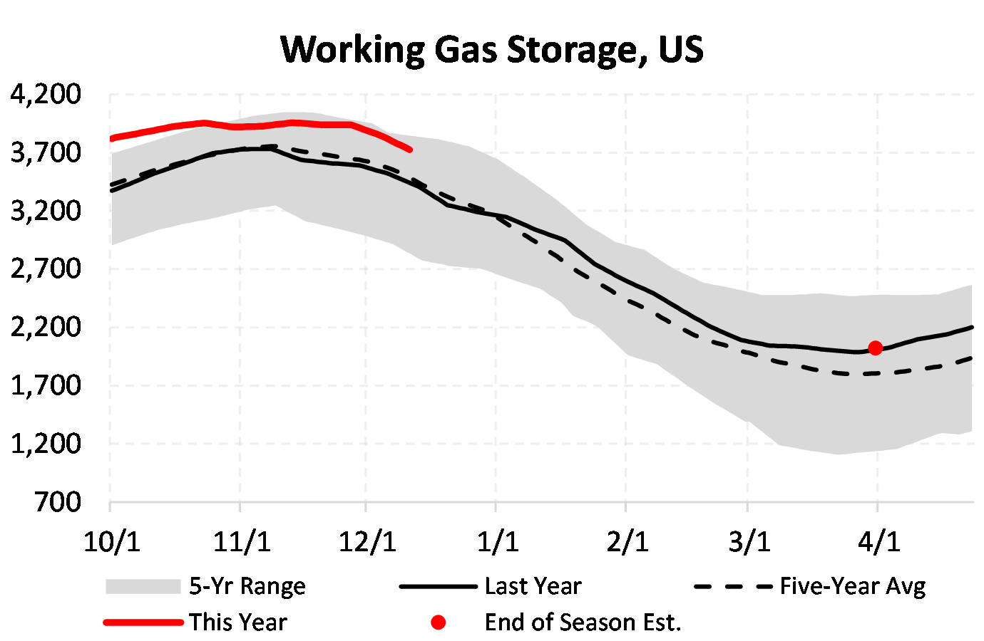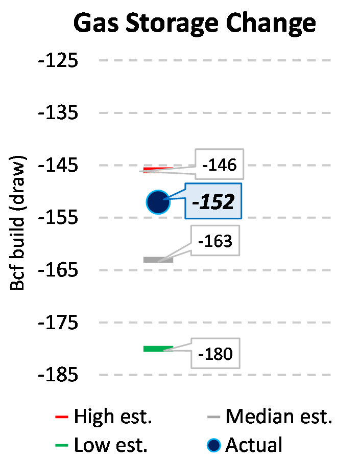 EIA reported a draw of -152 Bcf for the week ending 12/18/2020. This was smaller than the median estimate of -163 Bcf. Today's stat fell within the expected range, which was -146 Bcf on the more bearish end, and -180 Bcf on the more bullish end.