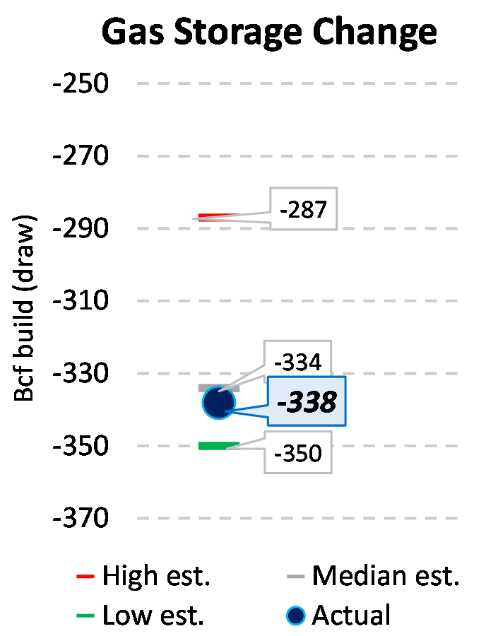 EIA reported a draw of -338 Bcf for the week ending 2/19/2021. This was larger than the median estimate of -334 Bcf. Today's stat fell within the expected range, which was -287 Bcf on the more bearish end, and -350 Bcf on the more bullish end.