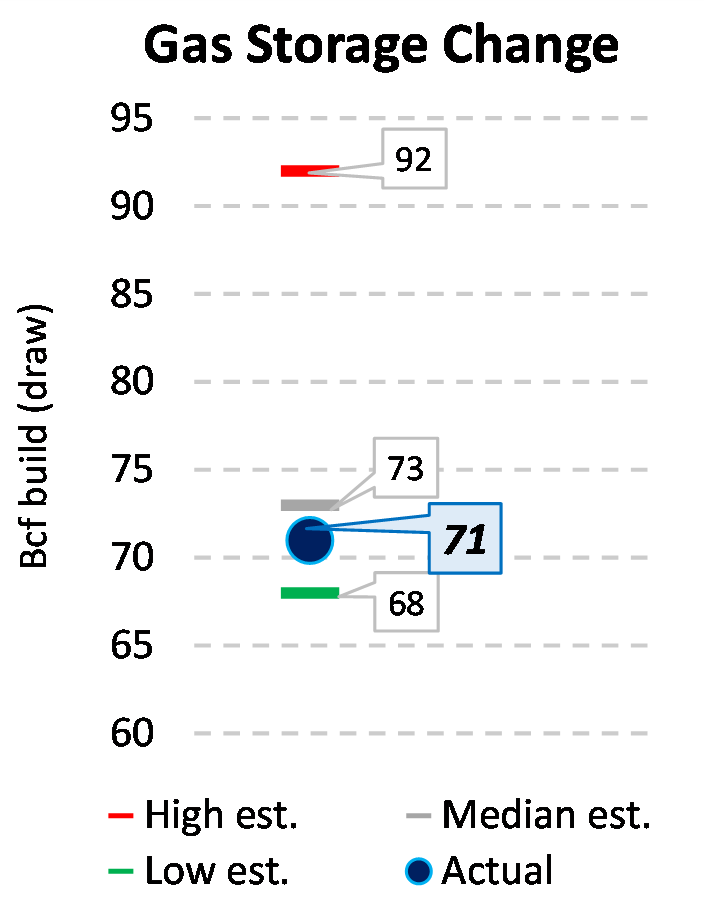 EIA reported a build of 71 Bcf for the week ending 5/07/2021. This was larger than the median estimate of 73 Bcf. Today's stat fell within the expected range, which was 92 Bcf on the more bearish end, and 68 Bcf on the more bullish end.