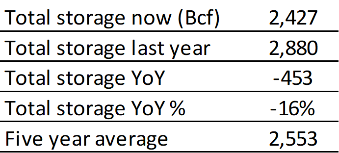 Pacific Gas and Electric has reclassified 51 Bcf (the largest ever) of natural gas in its storage system from working gas to base gas. The official number reported by the EIA was 16 Bcf, however, this is misleading as it includes the reclassified gas.